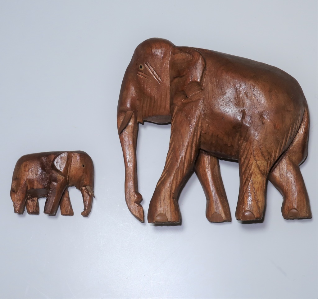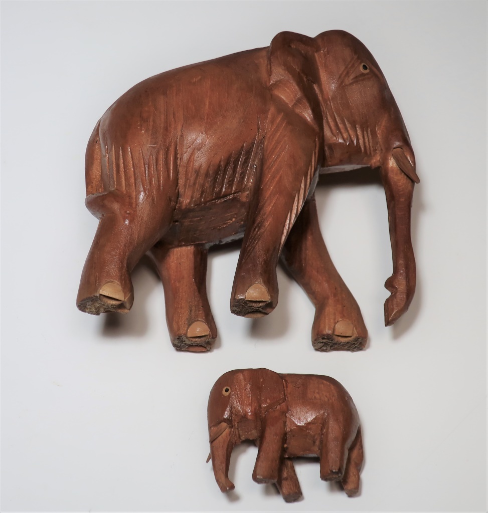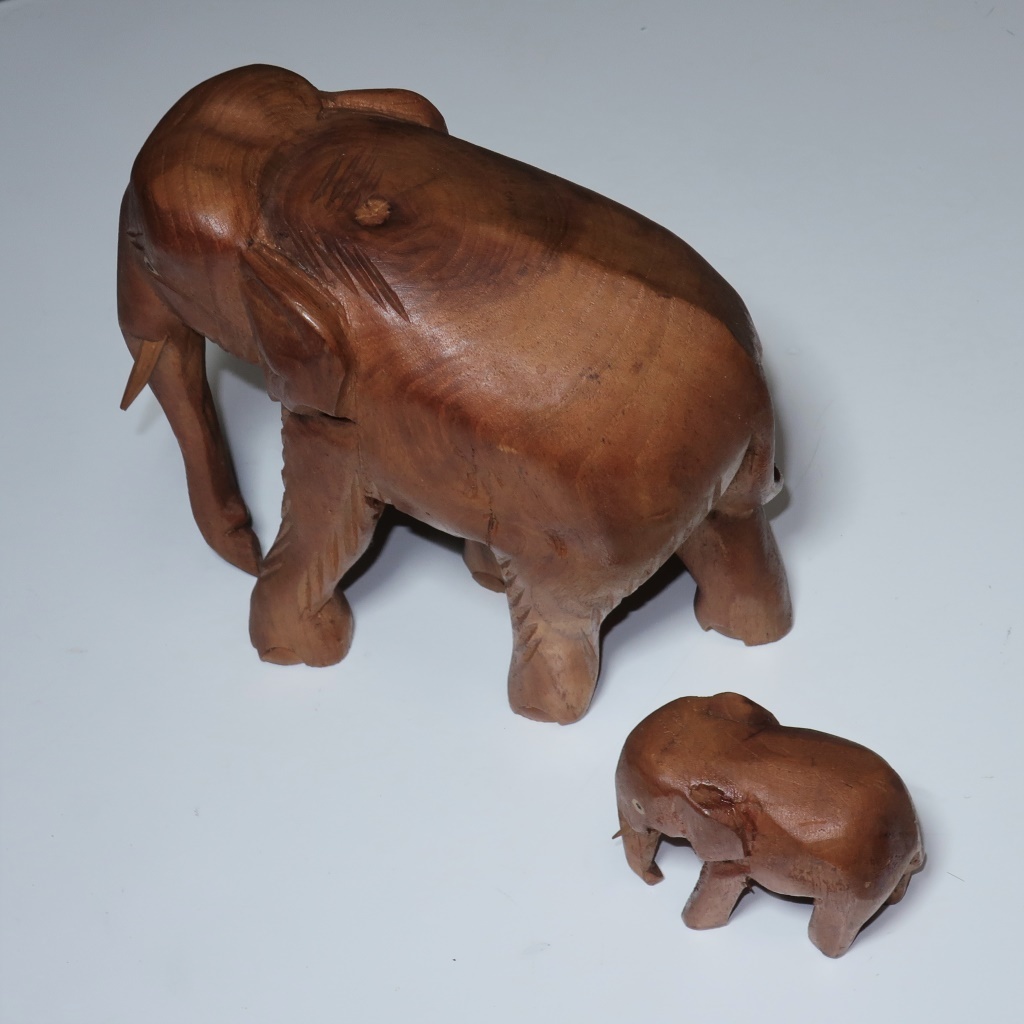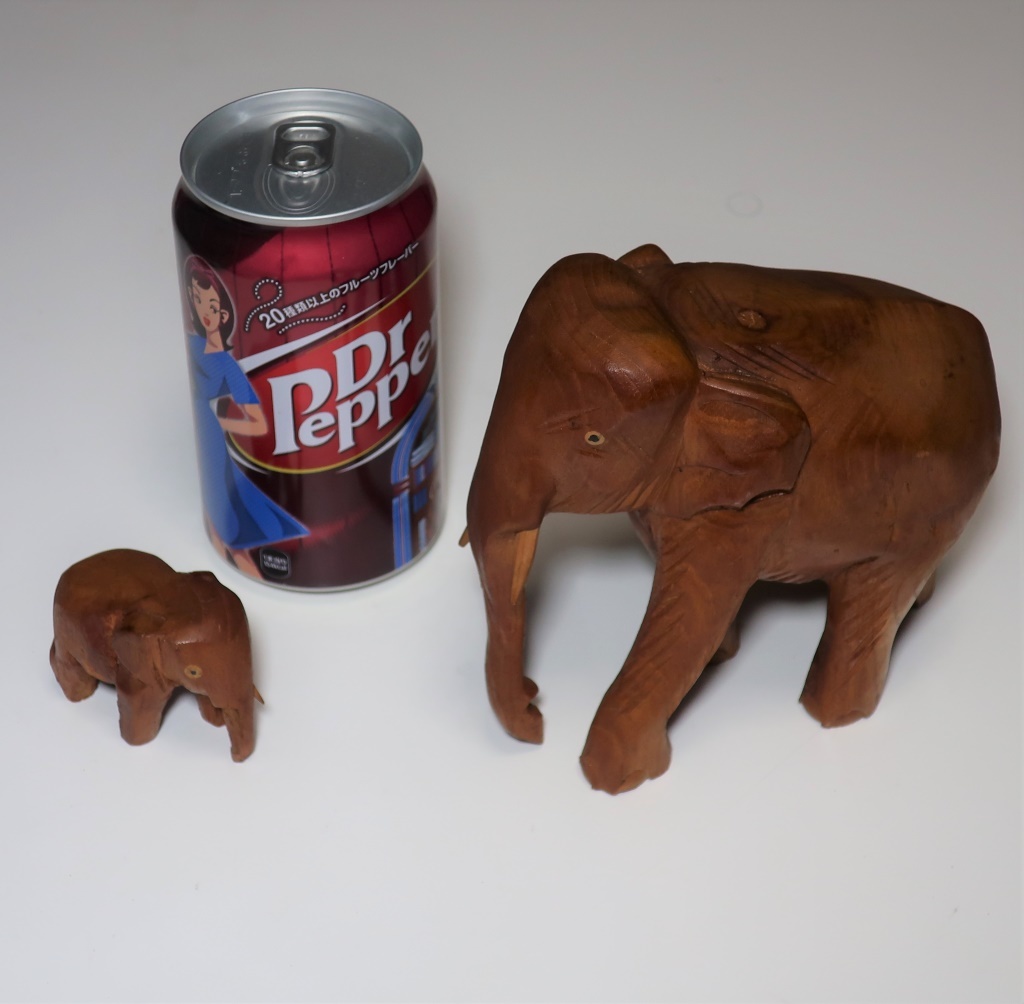 長期保管のお品です。 東南アジアの民芸品と思われますが、入手経緯不明です。 木の材質はそこそこ硬いもののようです。 小傷・塗りムラなど見られます。 民芸クオリティーですので、仕上げに荒い所もあるかと思います。 ◎ 全体をエタノールと刷毛で掃除しました。 サイズ : 親象 高さ13.5cm 縦 約14cm 横 約10cm 子象 高さ4.5cm 縦 約15.5cm 横 約3cm | |