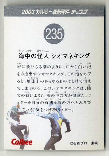 | ◆防水対策 厚紙補強 カルビー 仮面ライダーチップスカード(2003 復刻版) 235番 海中の怪人 シオマネキング トレカ 即決 | |
