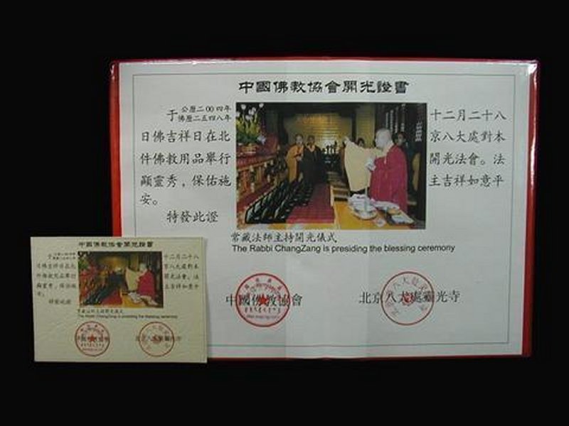 最後1枚の写真をご覧ください。本品にお付けする開光証書は、中国佛教協会と北京八大処霊光寺により発行されたものです。写真右側の大きい開光証書は、正式の原本です。(1,600件の開光品に対してたった一つの証書が発行されたのみです。小さい正式開光証書は、中国佛教協会と北京八大処霊光寺により発行された本品のための正式開光証書です。もし、落札者が大きいほうの開光証書が必要な場合は、コピーをお付けいたします。)