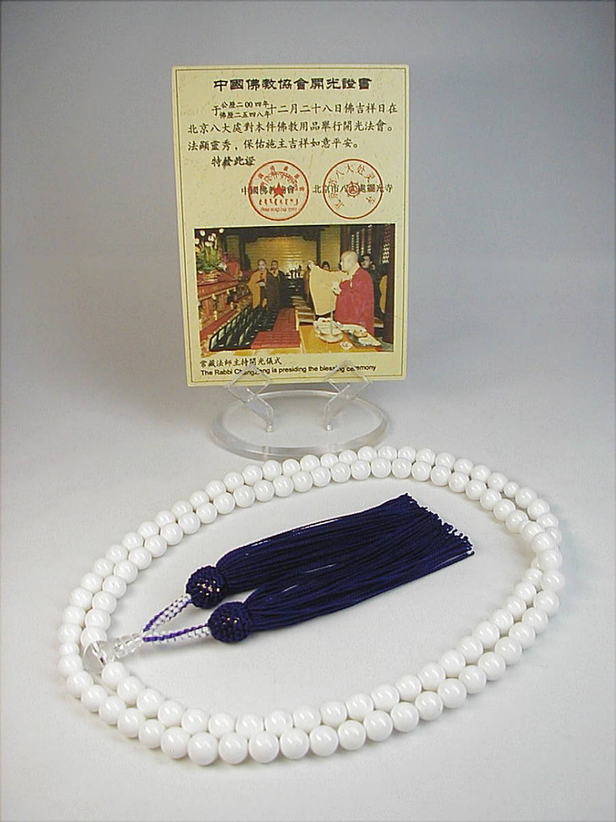 この品は、最高の材料を使用し、中国北京の中国工芸美術品総合会社の数珠製作名職人にお願いして 注文した品です。手作業により製作した品です。数珠に使用されている玉(主玉、三天玉)は、全て同じ品質珍品天然最高AAA級極珍品大粒シャコ貝の玉です。数珠に使用されている玉(親玉、ボサ)は、全て同じ品質天然最高AAA級極品大粒水晶の玉です。