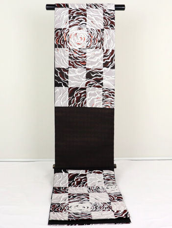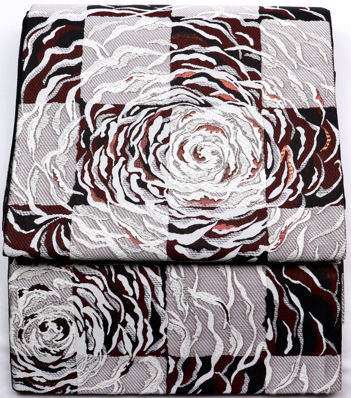 | 西陣織袋帯 松庵継ぎ紙 煌彩 赤紫・白・薄グレー地市松模様に縫い取り薔薇 新品 仕立て上がり | |