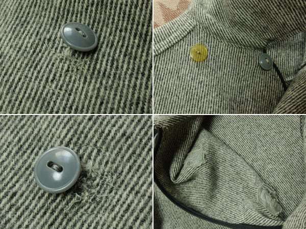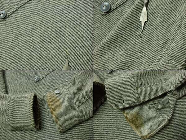 胸当て右上と左カフスのボタンが交換、胸当ての2つのボタン縫い付け部分にリペア、左ケンボロ横と背中上部に小さなダメージがあります。左袖口にやや目につく茶色シミがありますが、気にせず着られるヴィンテージ古着慣れされた方も多くいらっしゃると思います。そのほか左胸や袖口・裾周辺などにも薄いシミはありますが、これらは全く問題ないと思います。