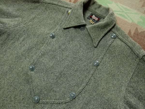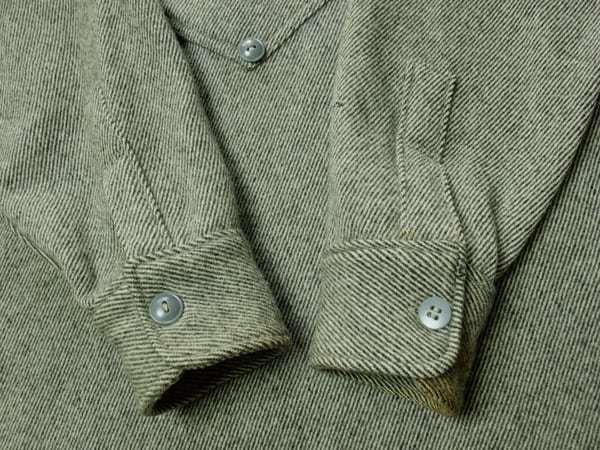 アビエイターやライダースジャケットのようにアシンメトリーに開くフロントが良く、個性的な着こなしが楽しめるウールシャツです。