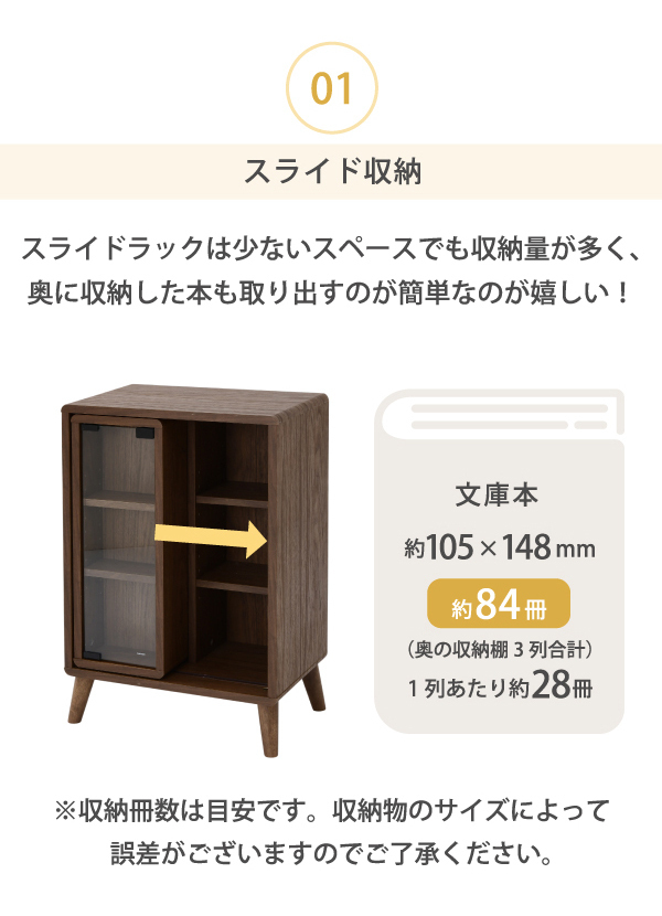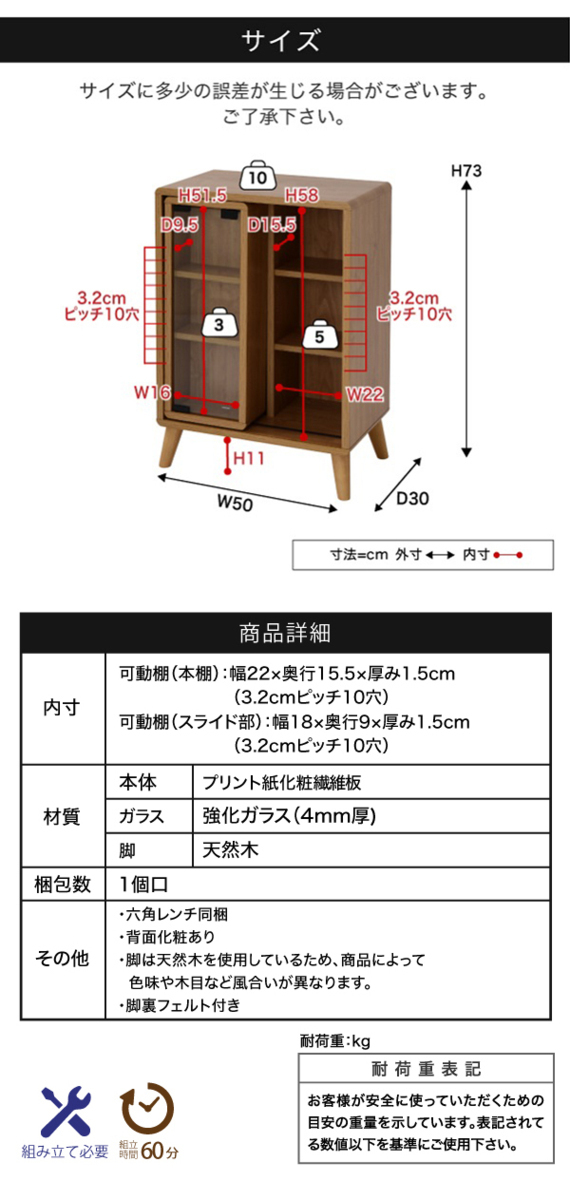 | 商品説明: | 収納するものから設計されたデザインだから、コンパクトでも機能的。 【商品仕様】 ■本体サイズ [外寸]約幅50×奥30×高さ73cm ■その他サイズ [内寸] (スライド部)約幅16×奥行9.5×高さ51.5cm (可動棚/スライド部)約幅18×奥行9×厚み1.5cm(3.2cmピッチ10穴) (奥収納部)各幅22×奥行15.5×高さ58cm (可動棚/奥収納部)約幅22×奥行15.5×厚み1.5cm(3.2cmピッチ10穴) (脚元空間)高さ11cm ■材質 [本体]プリント紙化粧繊維板 [ガラス]強化ガラス(4mm厚) [脚]天然木 ■収納量・耐荷重 [天板]約10kg以下 [可動棚/スライド部]各約3kg以下 [可動棚/奥収納部]各約5kg以下 ■備考 ・六角レンチ同梱 ・背面化粧有り ・脚は天然木を使用しているため、商品によって色味や木目などの風合いが異なります。 ・脚裏フェルト付き ■生産国 マレーシア ■組立時間(目安)(大人2人) お客様組立(60分) ■キーワード スライドラック 収納 省スペース オーブン おしゃれ スリム 隙間 低め 本 ホワイト 木製 白 スライド本棚 ウォールナット コミック 小さい ナチュラル 低い 木目 雑誌 ダークブラウン 文庫 ブラウン スライドたな すきま収納 ウォルナット スライド式本棚 収納棚 マンガ 書棚 ディスプレイラック コンパクト 天然木 飾り棚 透明 北欧 マガジンラック メープル 木目調 リビング ロー ワンルーム 雑貨 ブックシェルフ cd オープンシェルフ シェルフ 収納ラック ラック dvd リビング収納 ガラスキャビネット 北欧風 脚 スライド扉 可愛い リビングボード ディスプレイ 茶色 |
