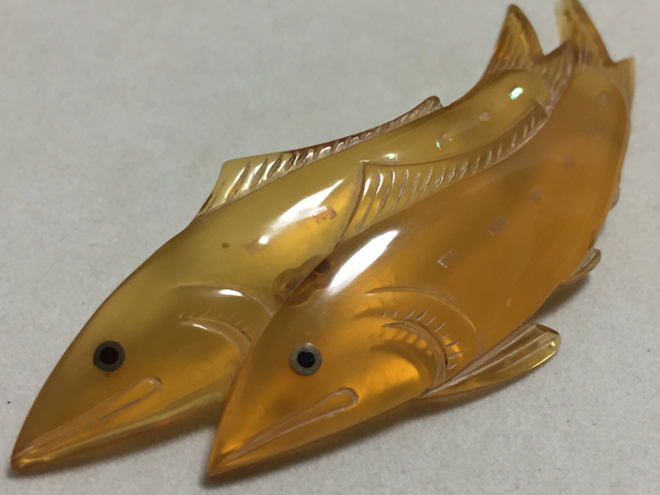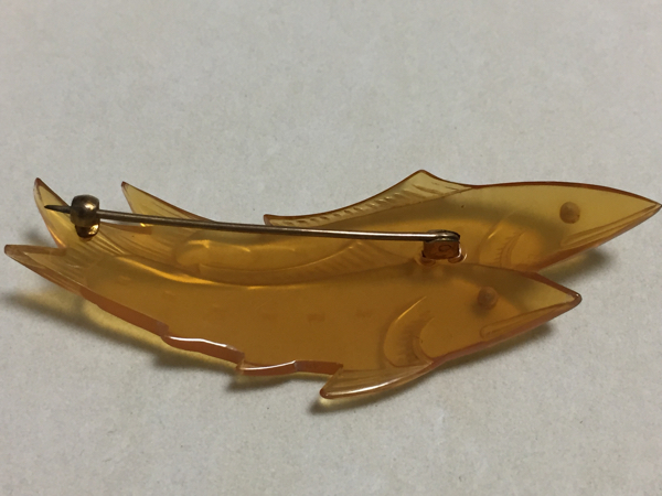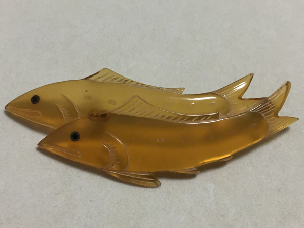 白甲の本鼈甲を使用した、双鮎細工のブローチです。鼈甲部分に欠けや虫喰いは無く、状態良好です。 縦2.7cm、横6.8cm、重さ4.6g