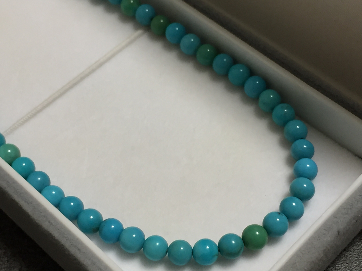 ターコイズ、K18を使用した、4㎜玉のロングネックレスです。金具部分には、K18の刻印があります。 長さ61.0cm、重さ13.5g ターコイズ 直径4㎜