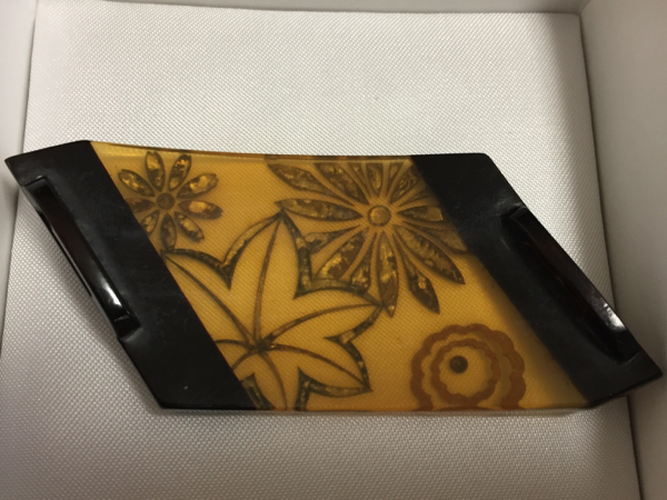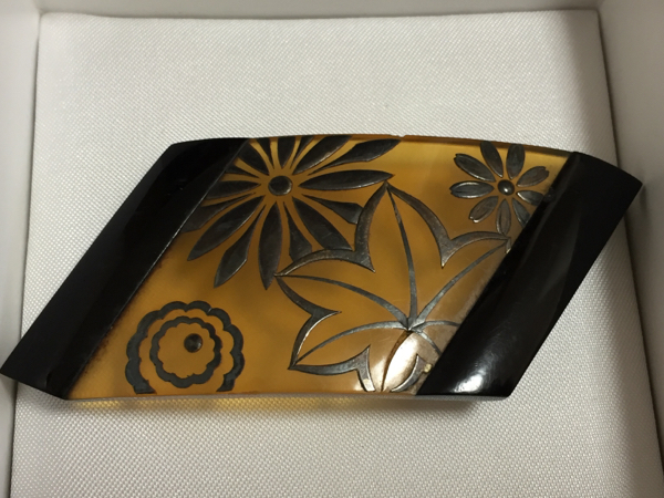 アンティークの白甲、黒甲の本鼈甲を使用し、銀象嵌を施した、花文のデザイン帯留めです。側面部、気にならない程度ですが虫食いがあります。ソーティング付属です。 縦3.2cm、横5.0cm、重さ9.0g
