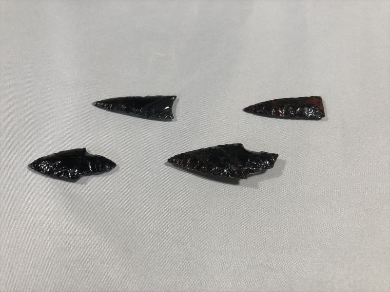 商品は黒曜石やじり4点セット (レプリカ)です。サイズ小さいもの 長さ約3.5cm大きいもの 長さ約4cm