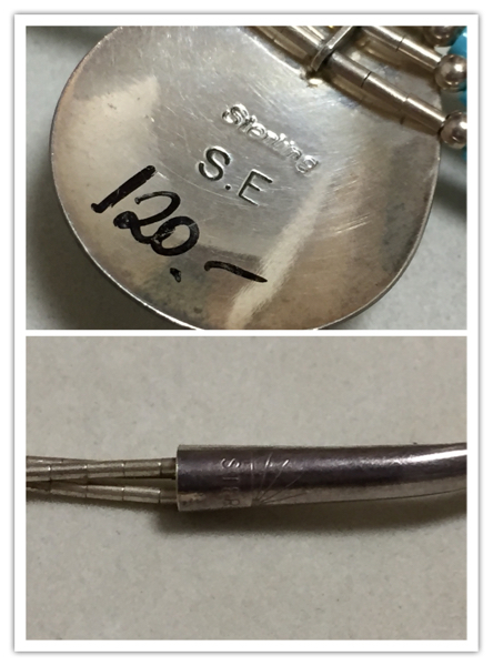 インディアンジュエリーの作家、S.Eによるターコイズ、STERLING SILVERを使用した、ドロップ形の3連ペンダントネックレスです。【S.E】【STERLING】の刻印があります。
