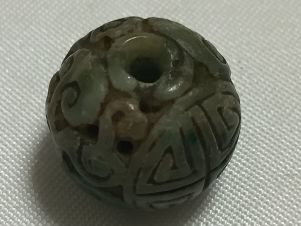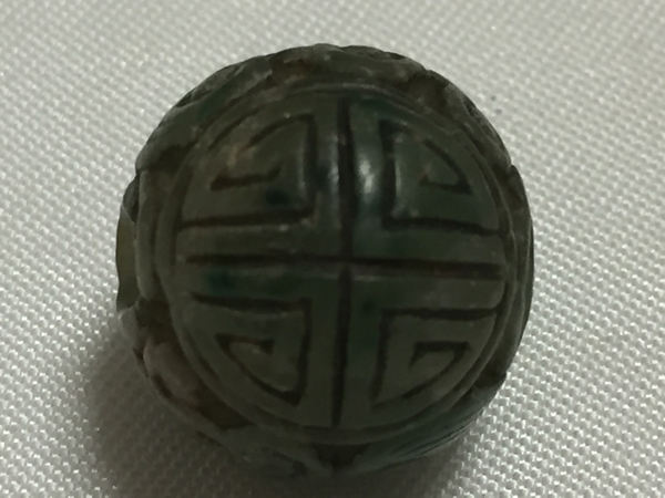 アンティークの本翡翠を使用した、細密彫刻の緒締玉です。 直径1.4cm、高さ1.3cm、重さ3.9g