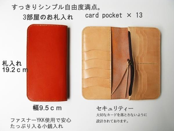 ●長さ19.2cmで1万円札もすっぽり入ります。カードポケットが13箇所にお札の入るポケットが2箇所、チャック付きの小銭入れがあり、使いやすさも最高です。