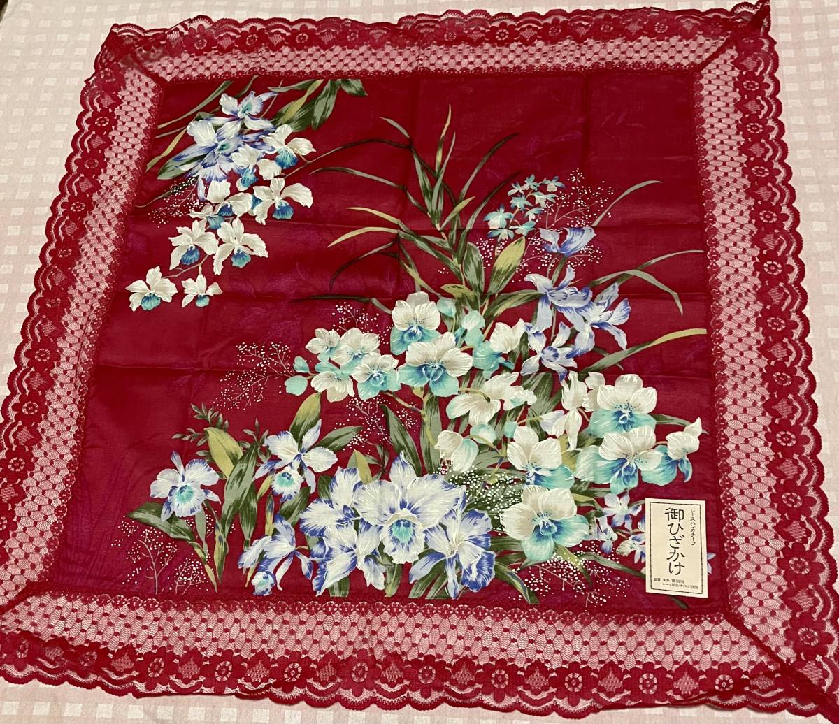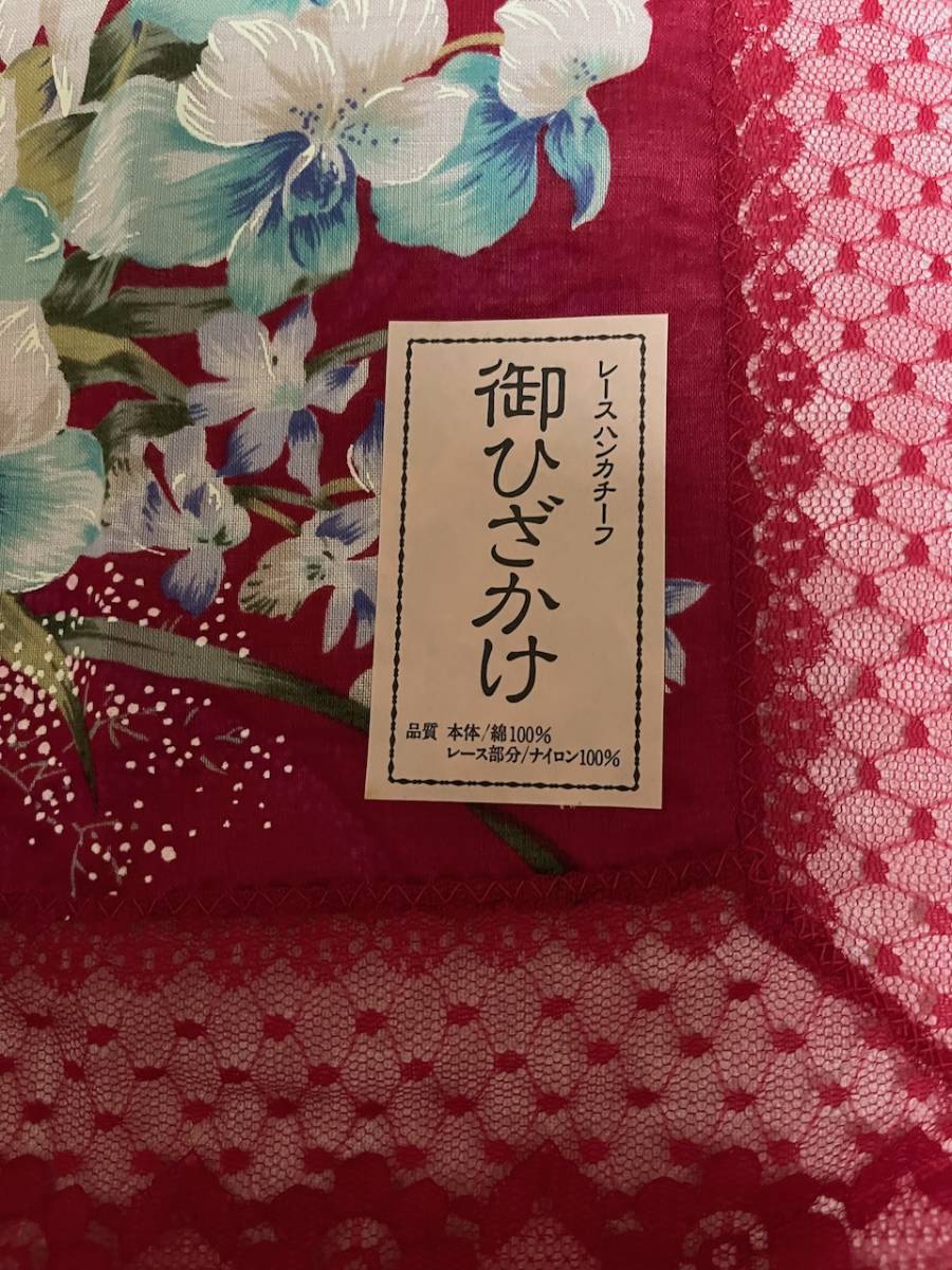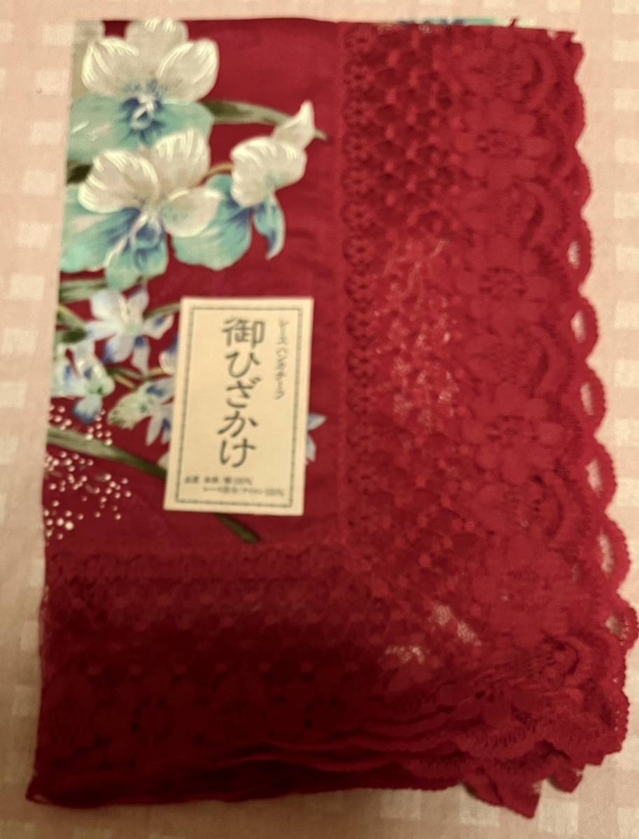 高級感のあるショッキングピンク(赤に近い)のレースひざかけになります。