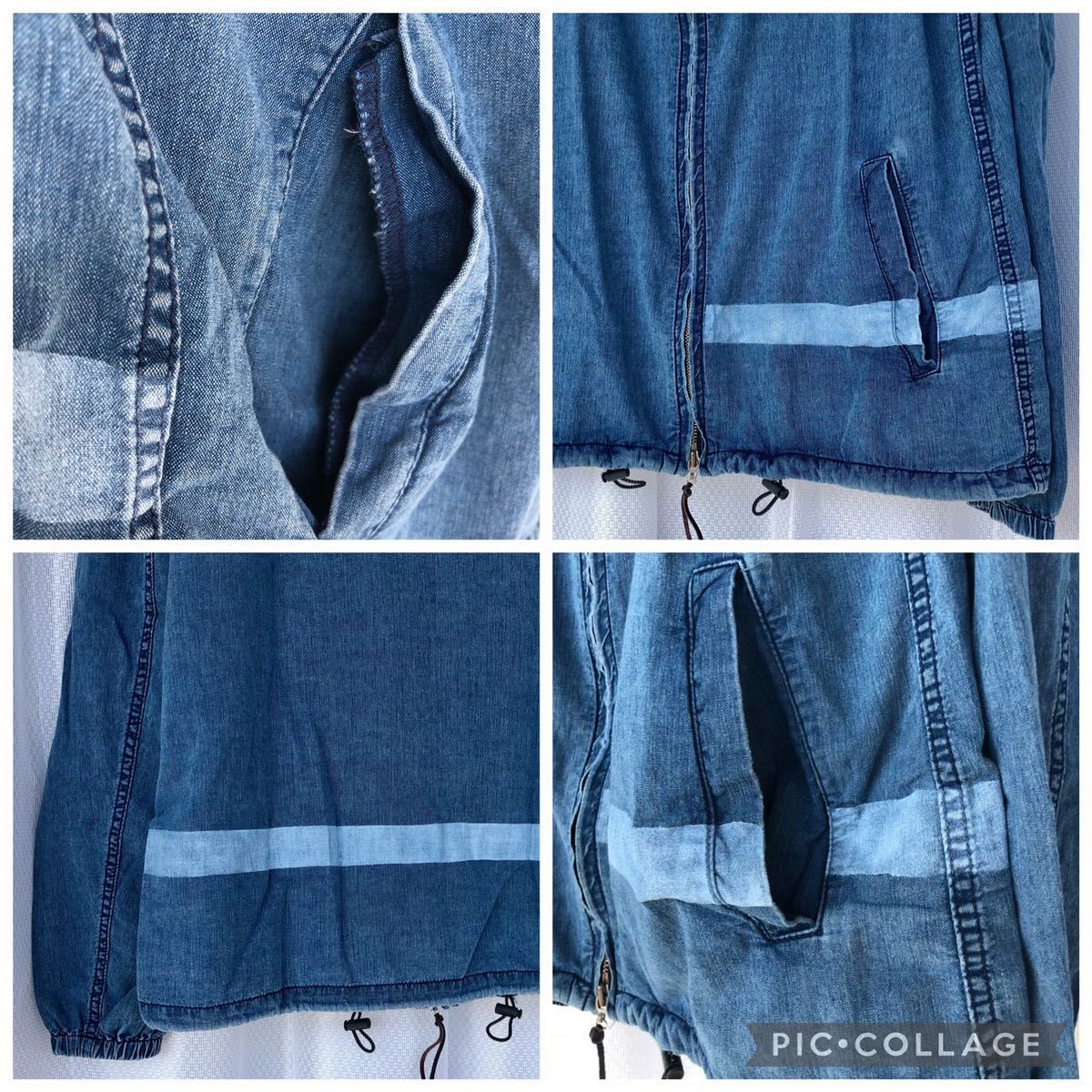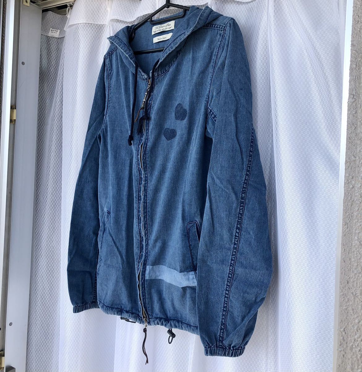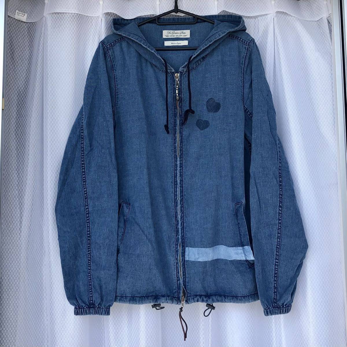 ◎特徴:ペンキプリント、ハート刺繍、薄手インディゴ、フロントジップ、外ポケット×2、裾ドローコード