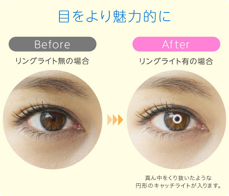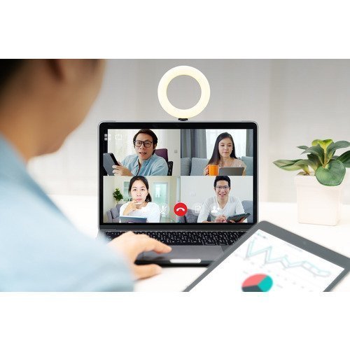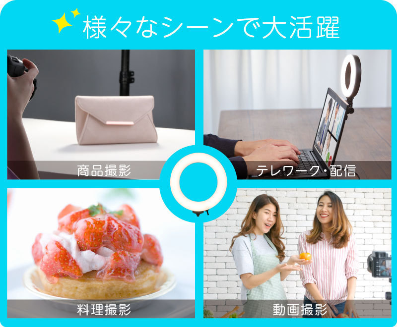 顔全体に万遍なく光を当てて不要な影を消すことで、ビデオ会議や動画撮影時に映る表情が健康的で明るくなると共に、ライトを円形にすることで瞳の中に白い輝きを生む「キャッチライト」を入れることができるので、生き生きとした輝きのある表情を演出することができます。