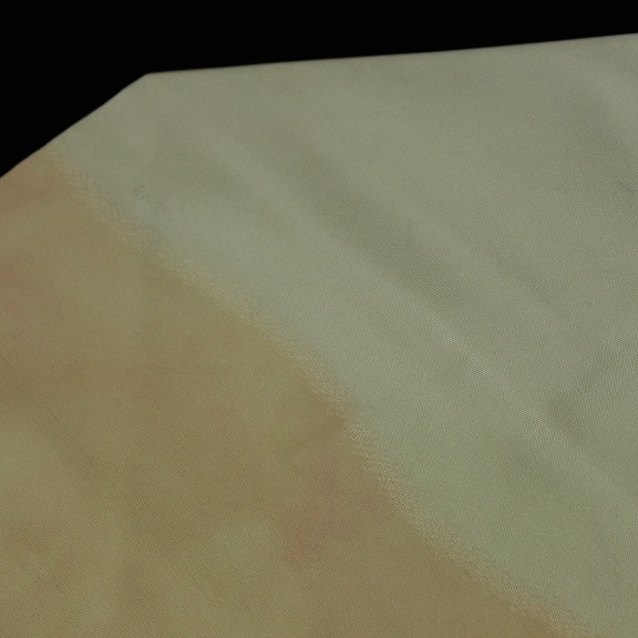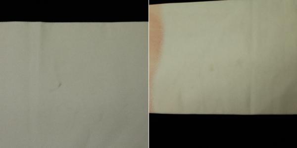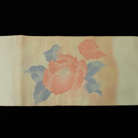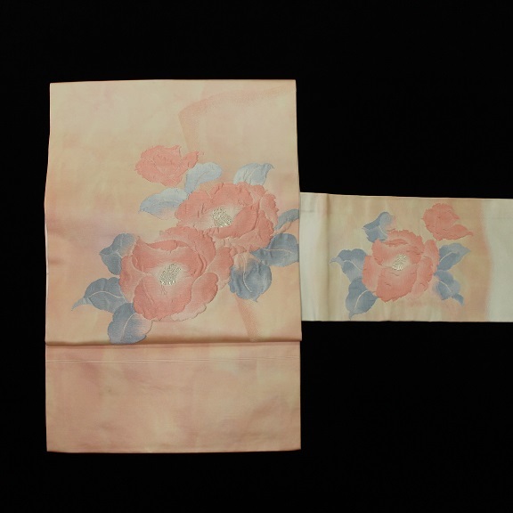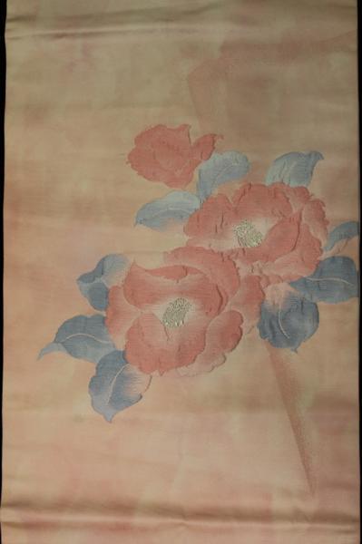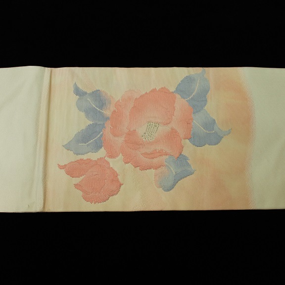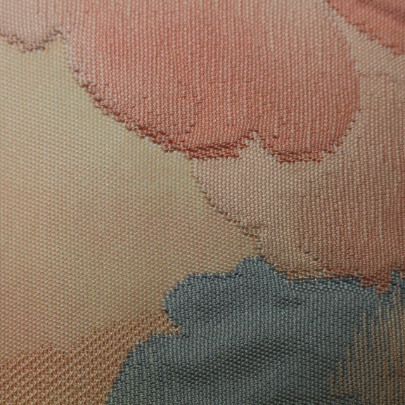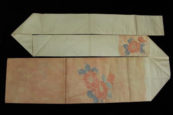 素材:正絹。ピンク色系です。幅約30.5cm、長さ約355.5cm。アンティーク着物ご理解の方でしたら着用可能な範囲ですが垂れ先より7cmあたりに薄汚れがあります