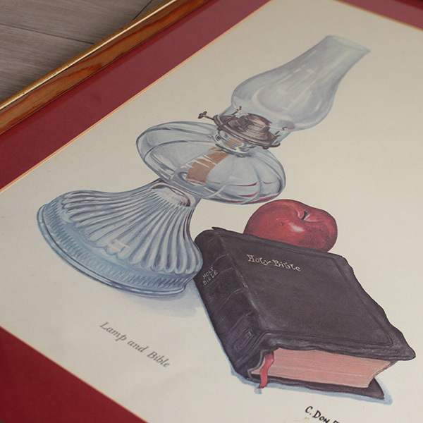 ランプと聖書の他にリンゴなども描かれていて、とても素敵な作品です。