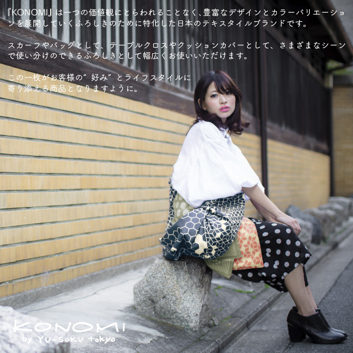 『KONOMI』は一つの価値観にとらわれることなく、豊富なデザインとカラーバリエーションを展開していくふろしきのために特化した日本のテキスタイルブランドです。 スカーフやバッグとして、テーブルクロスやクッションカバーとして、さまざまなシーンで使い分けのできるふろしきとして幅広くお使いいただけます。 この一枚がお客様の”好み”と、ライフスタイルに寄り添える商品となりますように。 |