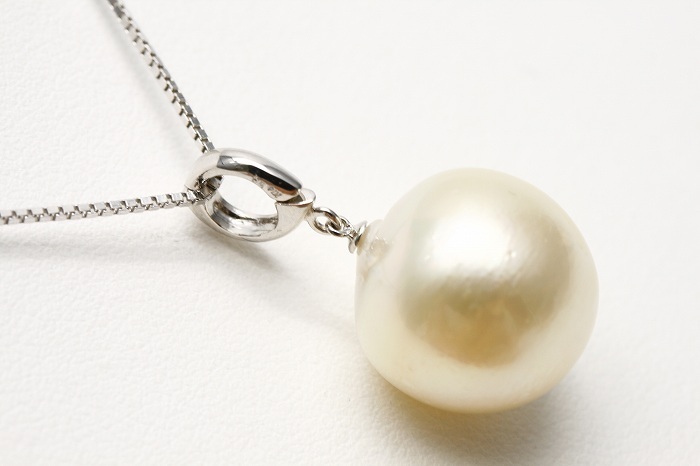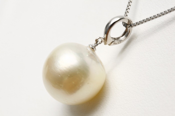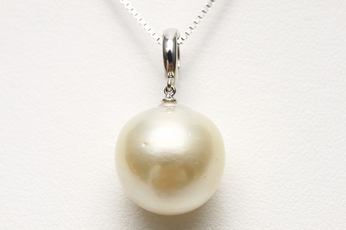 希少な14mmサイズの南洋白蝶真珠ペンダントです。 南洋真珠は約10?12mmサイズの大珠が多くできますが, ここまでのサイズのものは非常に珍しいです。 上品なホワイトカラーのお色目が出ています。 整ったフォルムでキズは見られます。 金具は開閉可能のクリッカータイプです。 この一粒を胸元に飾るだけで全体の印象ががらりと変わる一品です。 | |