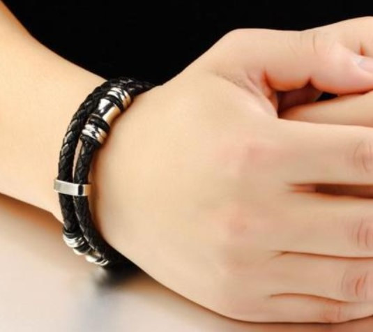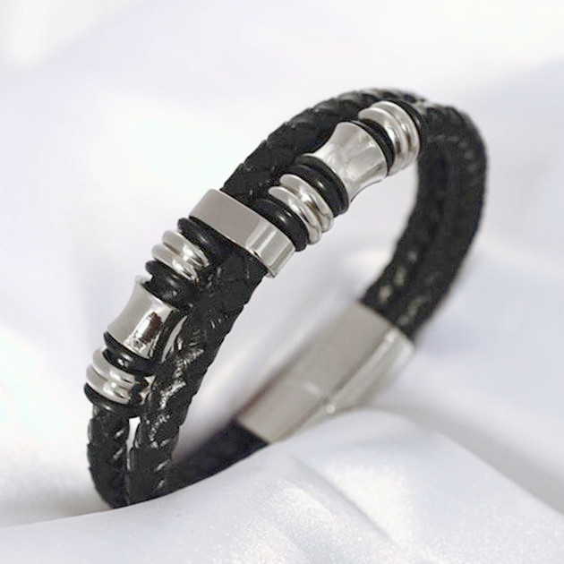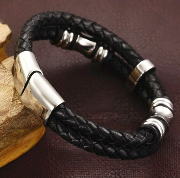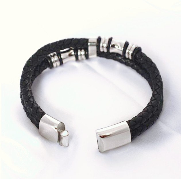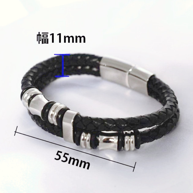 ●素材:レザー、ステンレス。●サイズ:内周約21.5cm(腕回り18~19cm最適)。●重さ:32g。