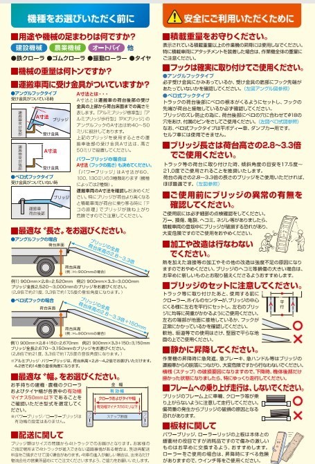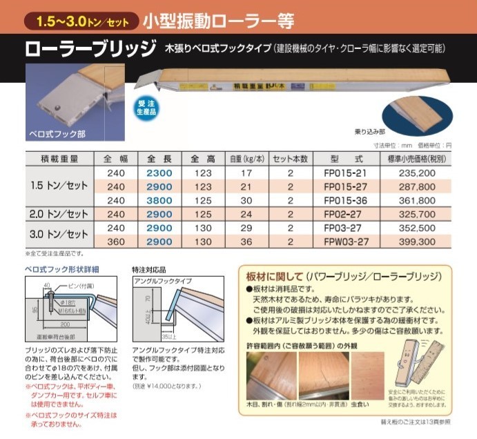 【商品詳細】 ▼▲▲ 受注生産】につき約3週間程かかります ▼▲▲br>■〔法人・個人事業のお客様〕への発送とさせて頂きます。ご注文時に会社名(事業所名)の記載をお願いします。 br>ローラーブリッジ 木張りベロ式フックタイプ 積載荷量3.0トン用 2本セット 名称:FPW03-27 全幅(mm):360 全長(mm):2900 全高(mm):130 自重(kg/本):36 小型振動ローラー等 建設機械のタイヤ・クローラ幅に影響なく選定可能 ※こちらの商品は、受注生産、メーカーからの直送になります。 ■写真は、イメージです。 メーカーホームページはこちらから日軽金アクト株式会社 こちらの商品は法人様のみ車上渡し元払いになります。 個人様は、運送会社様の営業所止めになります。 ※仕様は予告なく変更になることがございます。 ※下記注意事項の確認をお願いいたします。