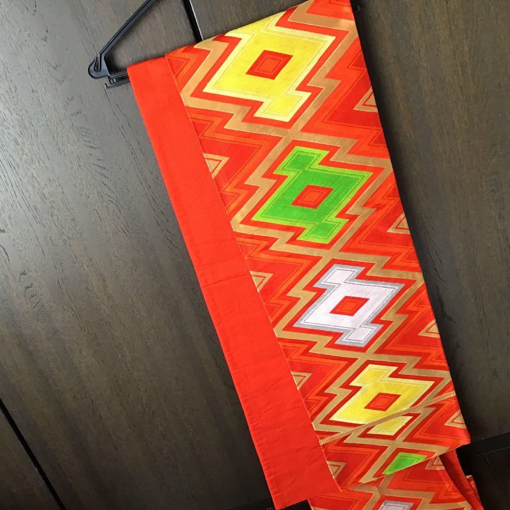 表生地のオレンジ系の生地と菱形の織糸は、金属糸以外は正絹です。