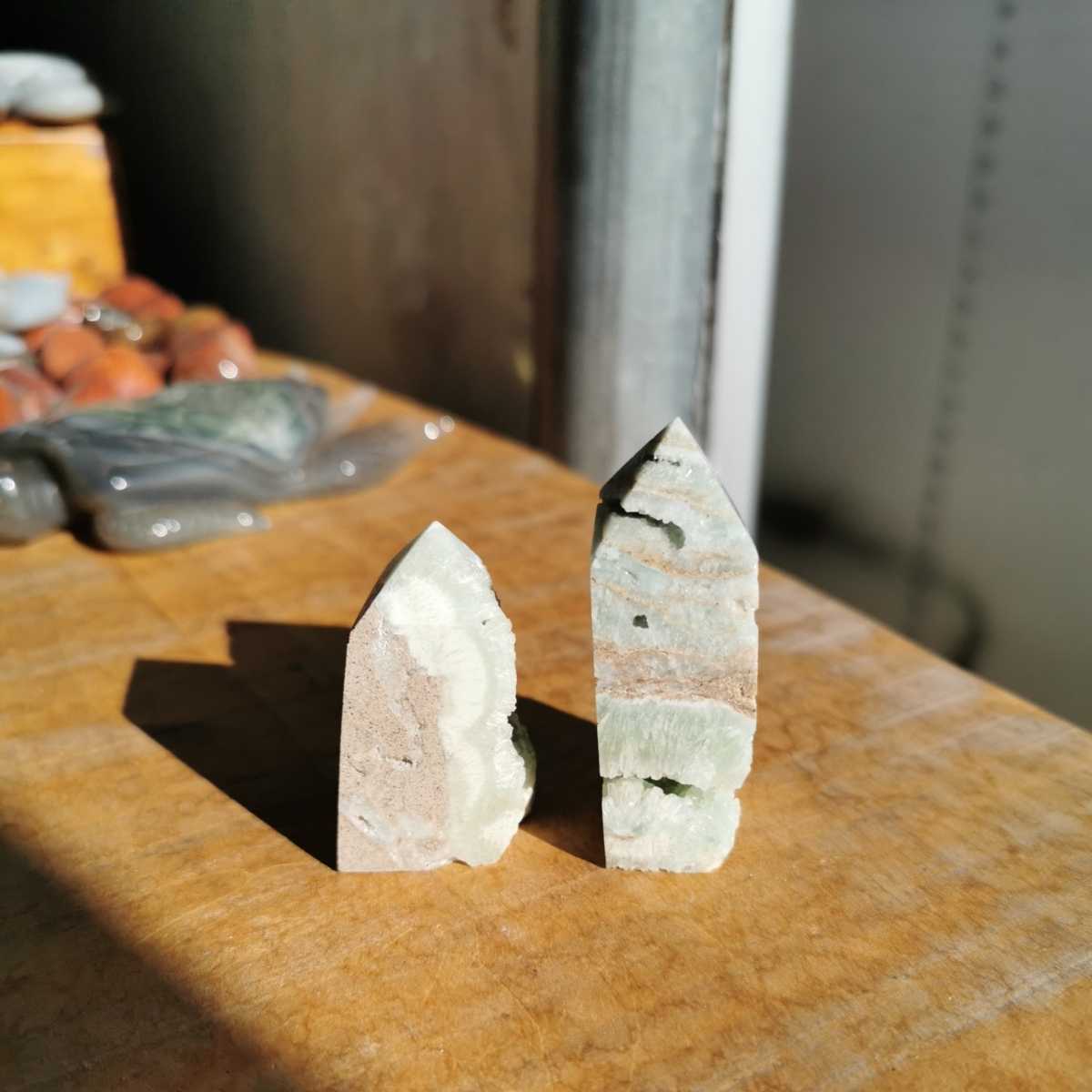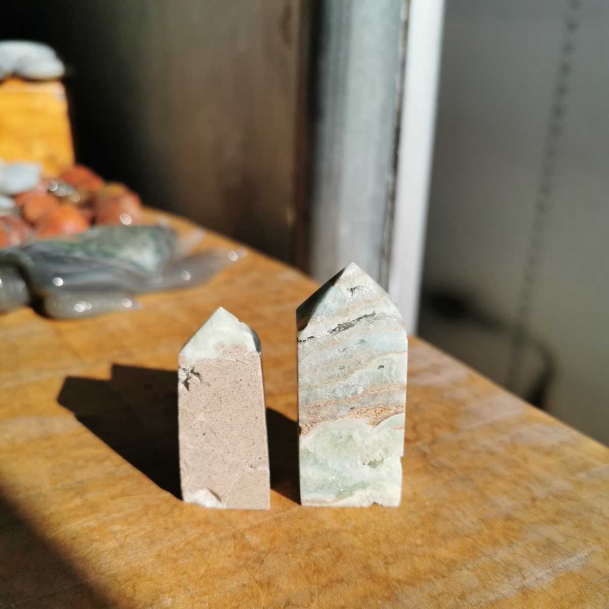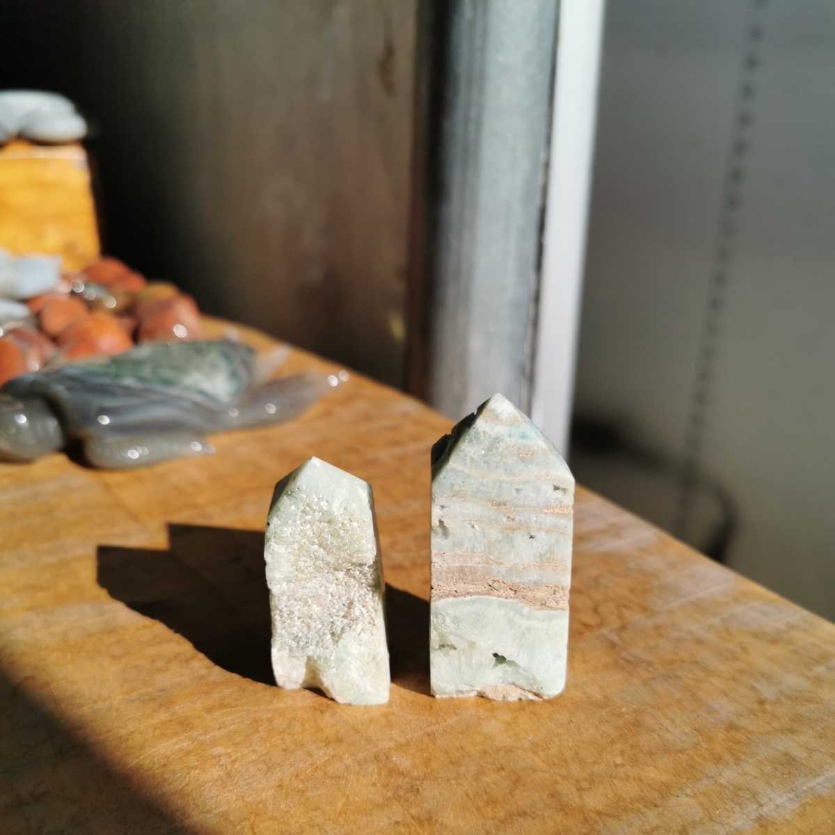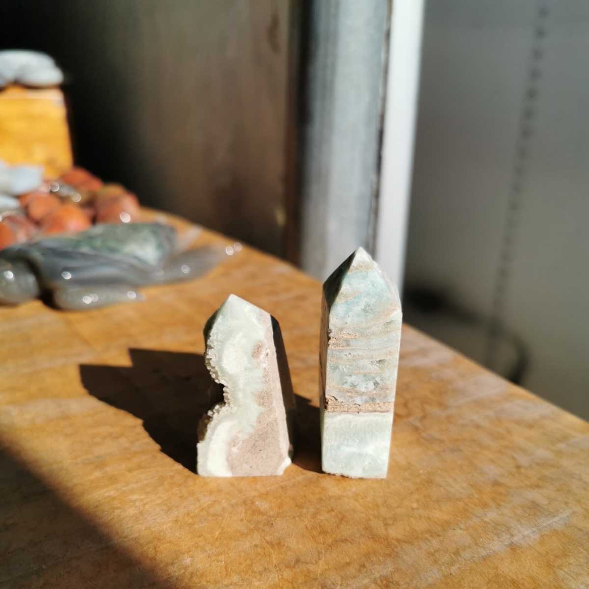 2石で重さ87.4グラム!左 高さ4.5センチ横2.1センチ奥行き2.5センチ!右 高さ5.7センチ横2.4センチ奥行き1.9センチ!ヘミモルファイト!鮮やかな水色で綺麗です!送料無料宜しくお願いします!