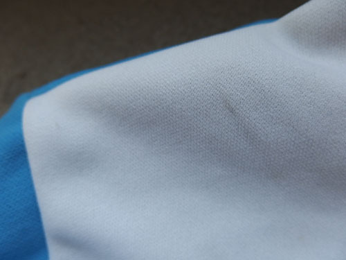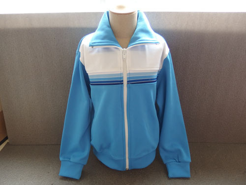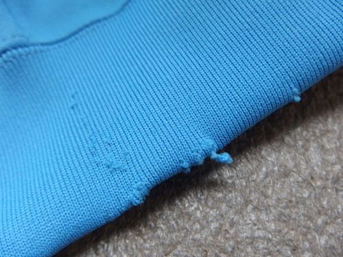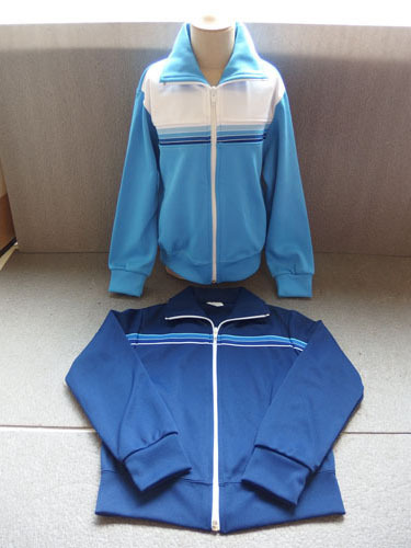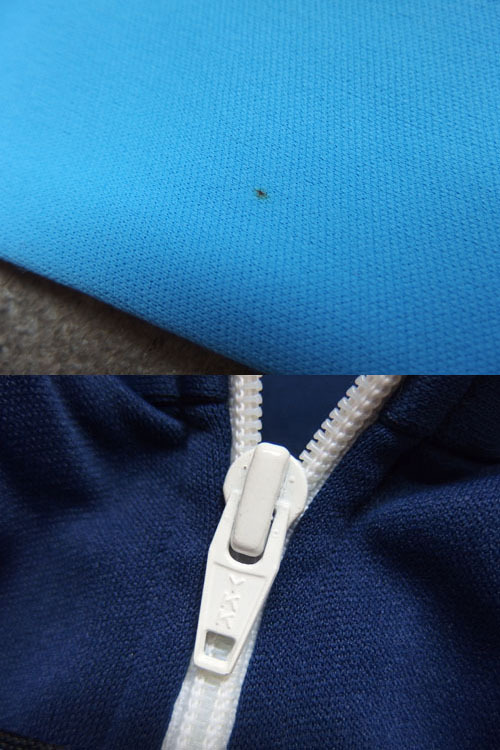 ※水色ジャージの腕部分に汚れが見られ、裾にほつれが目立ちます。