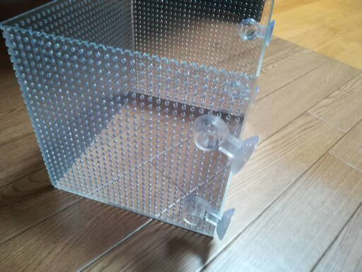 サイズは幅24cm,高さ20cm,奥行き20cmです。前面(鑑賞面)・底面だけ、透明クリアになっていますので、フィルターなし・水換えなしで利用可能です。かなり便利。(前面・底面以外はパンチング)ある方からの依頼での製作で大変喜ばれたモデルです。同時に出品しています多目的ケースと併用すればいろいろな飼育方法ができるかと思います。また、成長にあわせて使用すれば稚魚の引越し時のリスクの軽減・または追いつけない親魚の産卵ペースへの対応に大変便利です。ご質問はご遠慮なく。ノークレーム・ノーサポートをご了承いただける方の入札をお待ちしています。梱包料、消費税、手数料の請求は一切ありません。ほかにも出品していますので宜しくお願いいたします。同時落札していただけましたら、送料・お振込み手数料がお安く済みますのでお勧めです。 ただいま取り付け用のキスゴム(新品)をサービス中です。ご検討を・・・!! また、このケースは前面(鑑賞面)が一面透明となっておりますので、鑑賞にバッチリです。吸盤固定ですと、劣化が早く本水槽にケースごと落下ということが度々ありますが、キスゴム利用ですので格段にトラブルを防止できます。高さが20cmと少しハイタイプのサイズの多目的ケースも出品しています。そちらもご覧になってみてください 。