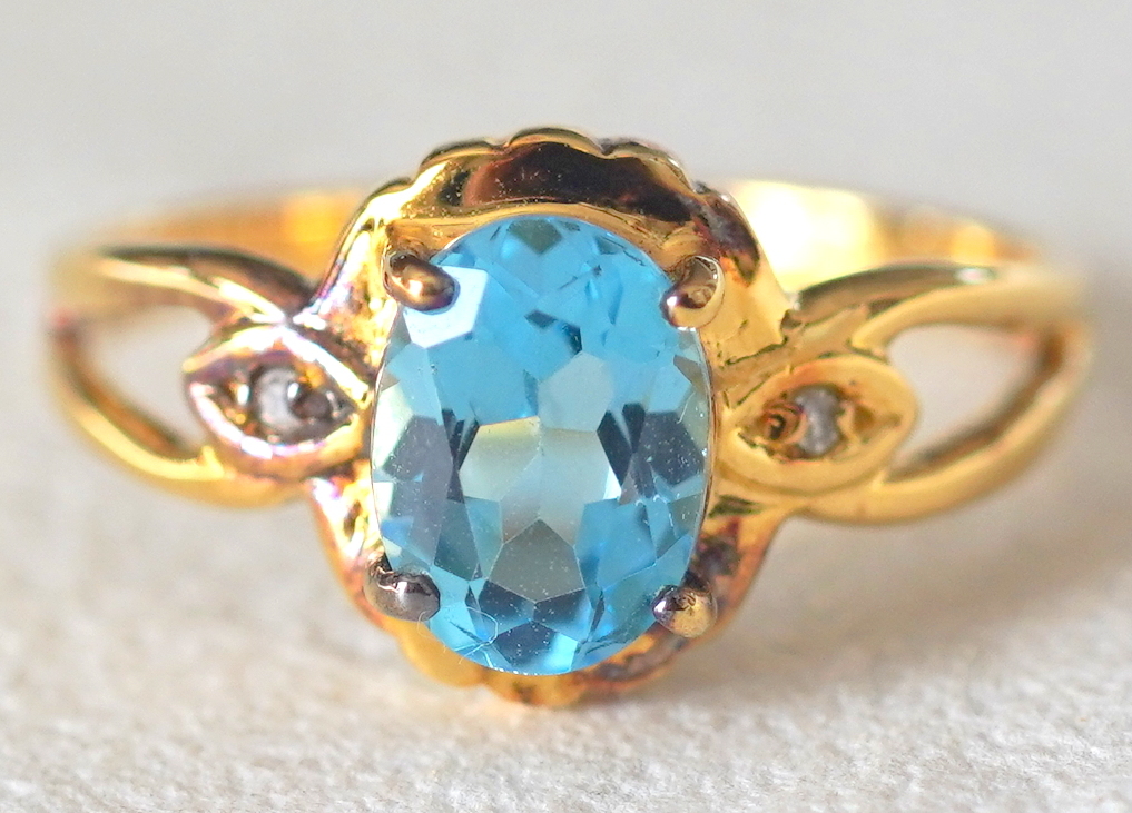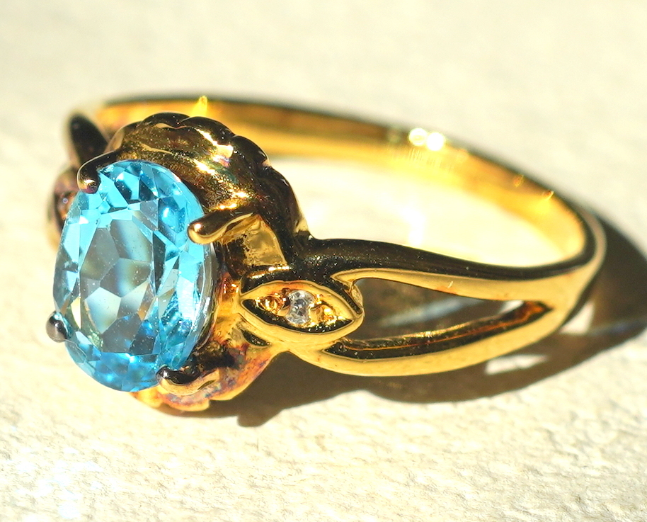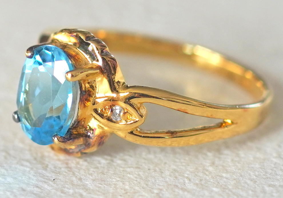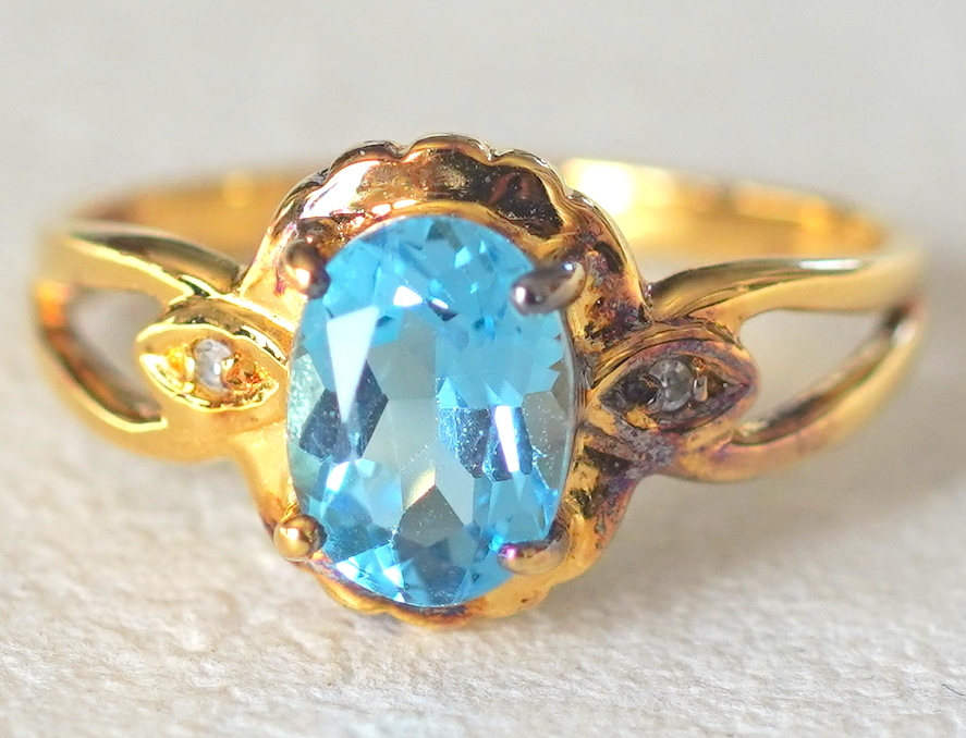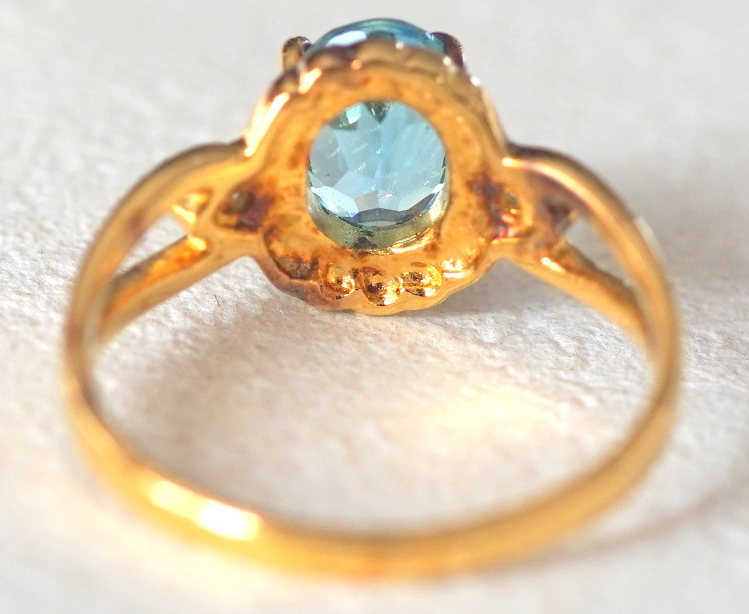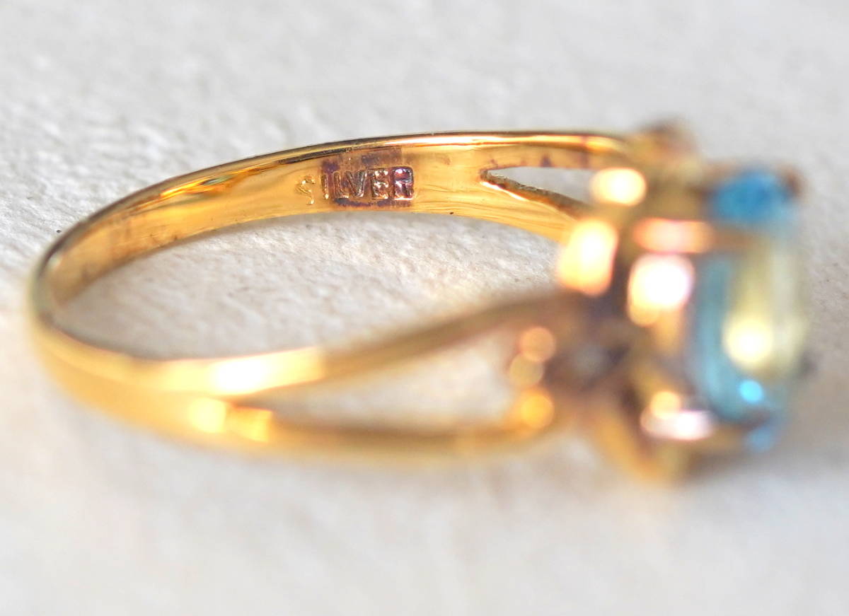 水色の石付きゴールドカラーのシルバー製リングです。