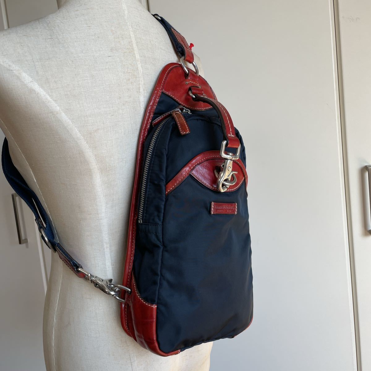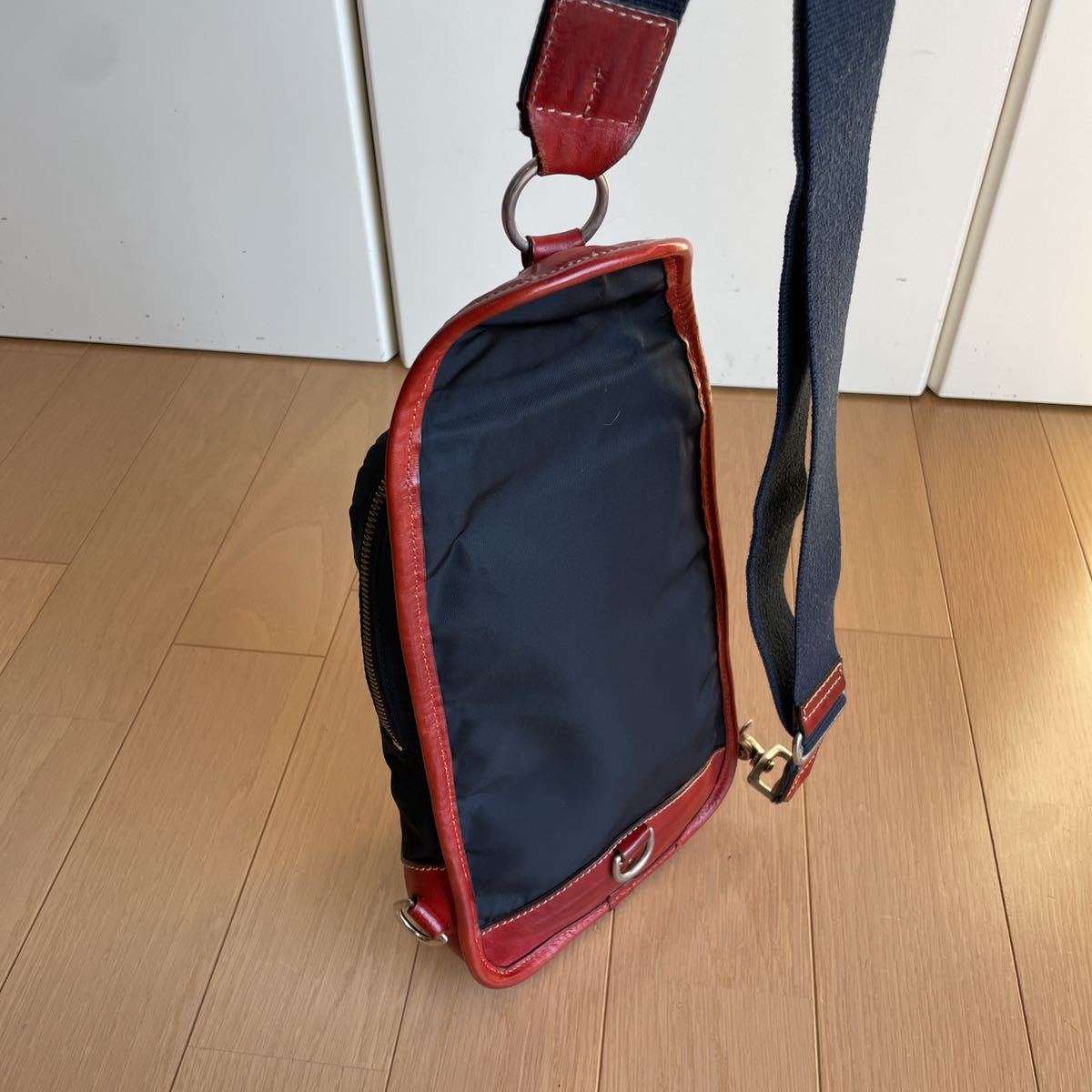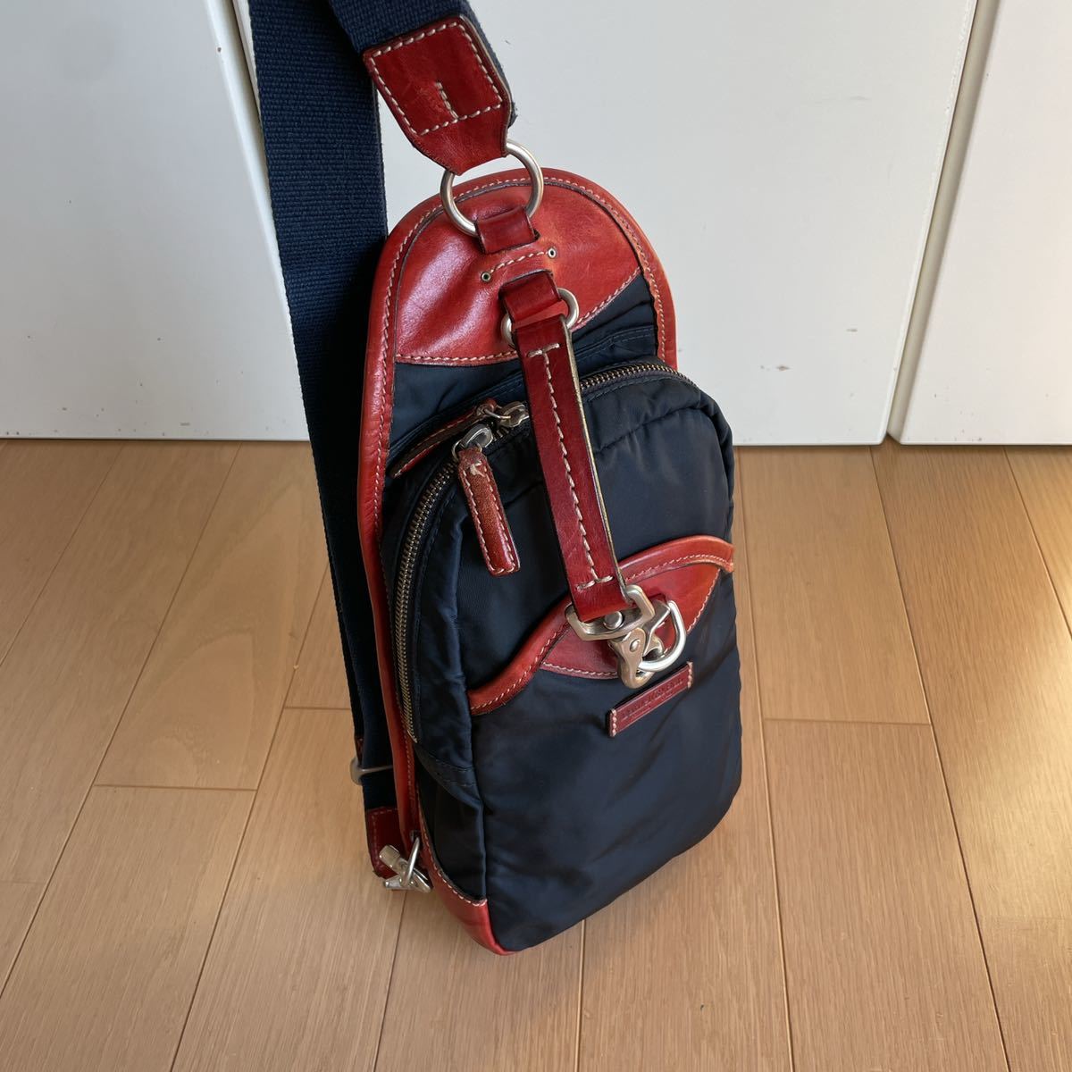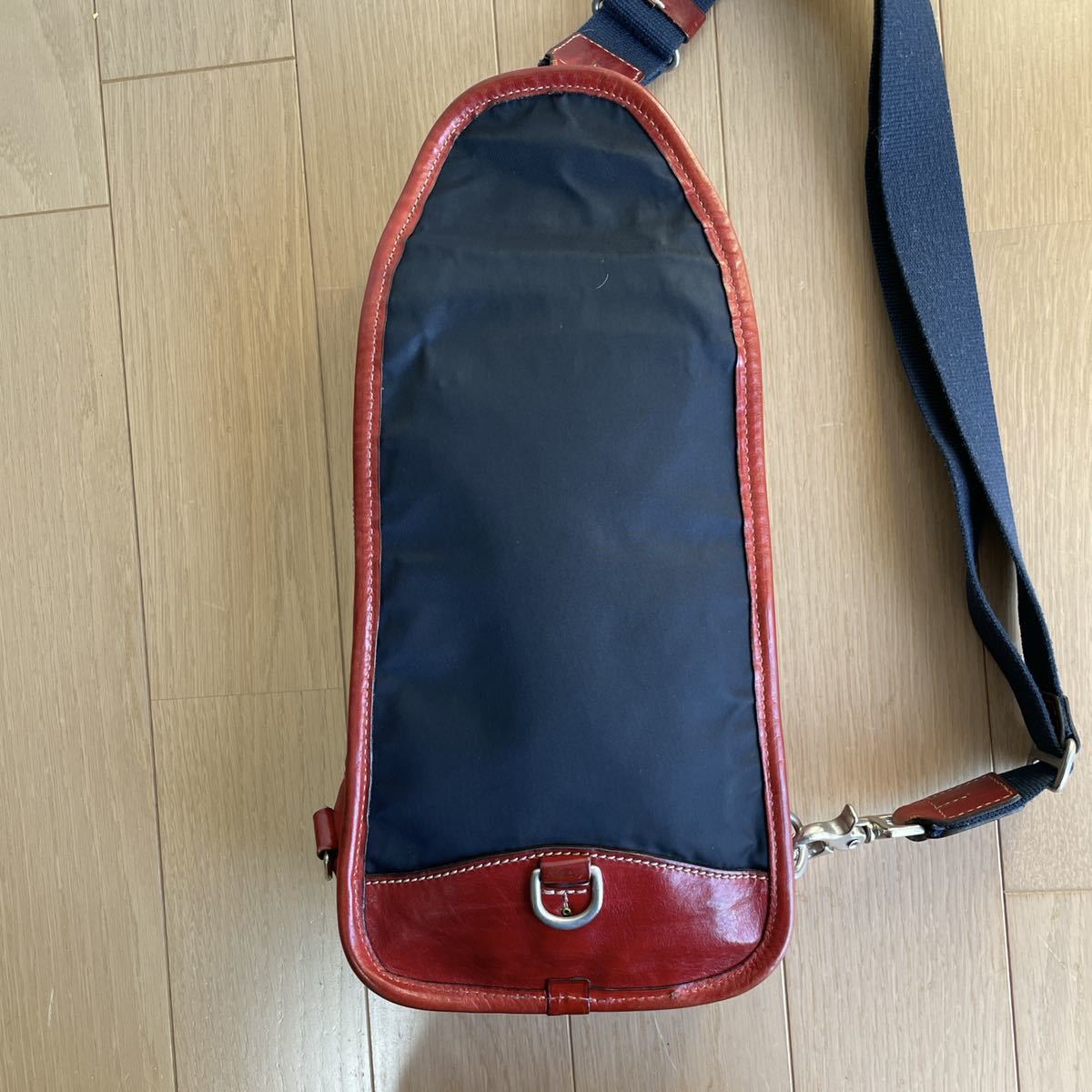 よくあるロディレザーではなくネイビーのナイロンとレッドブラウンのスムースレザーコンビで軽くて非常におしゃれです。