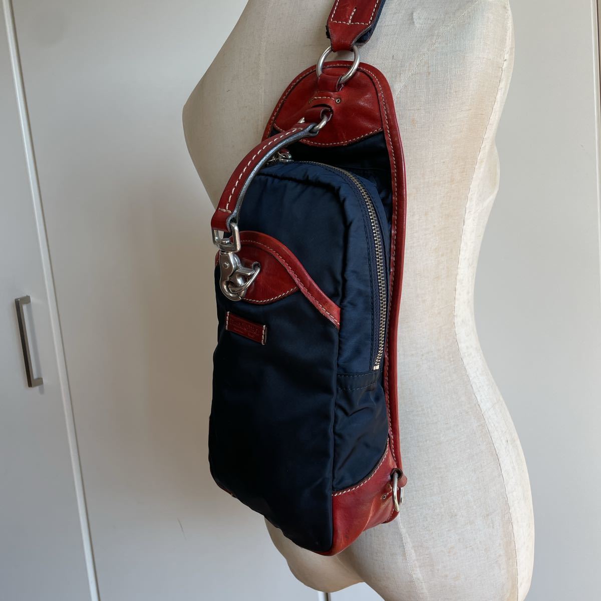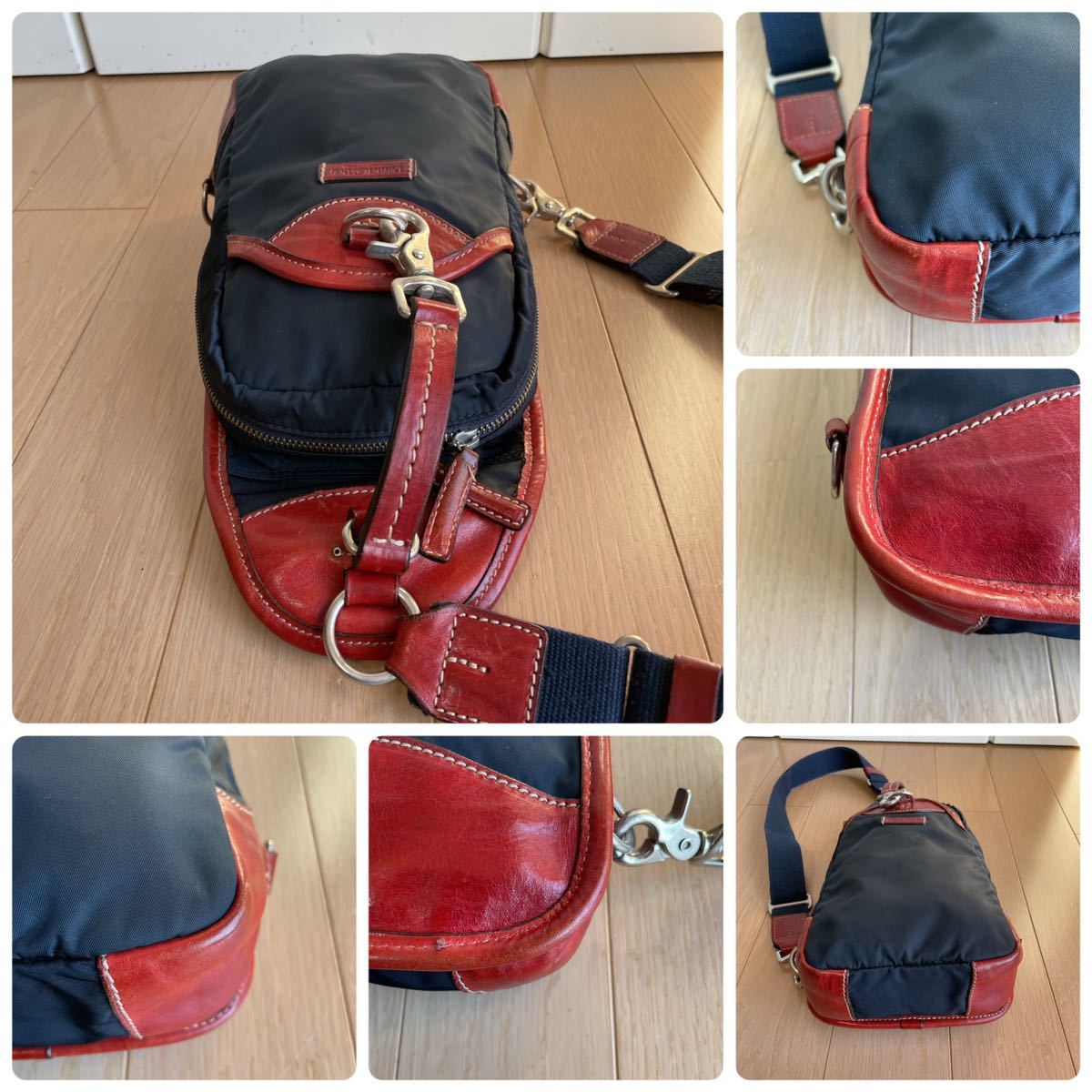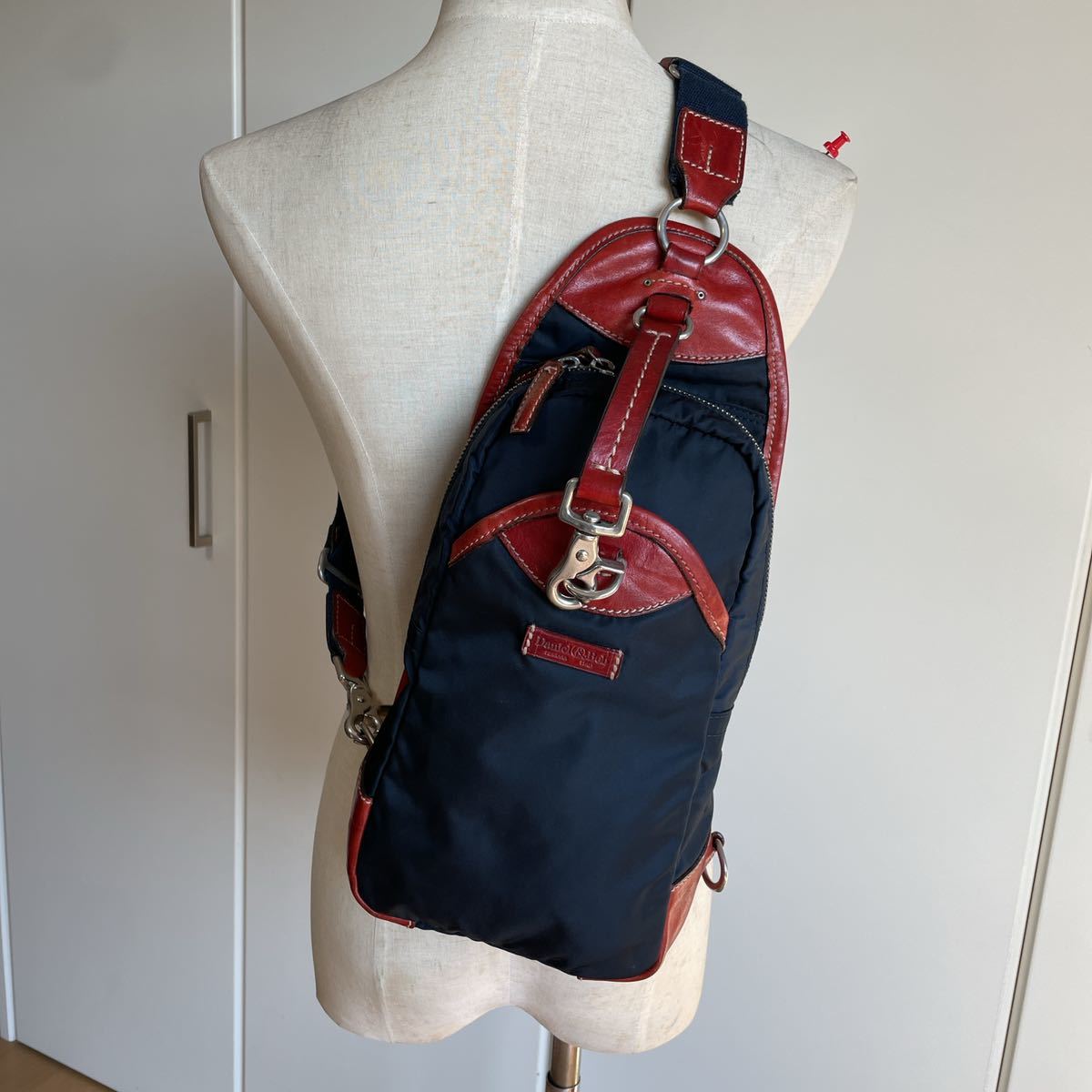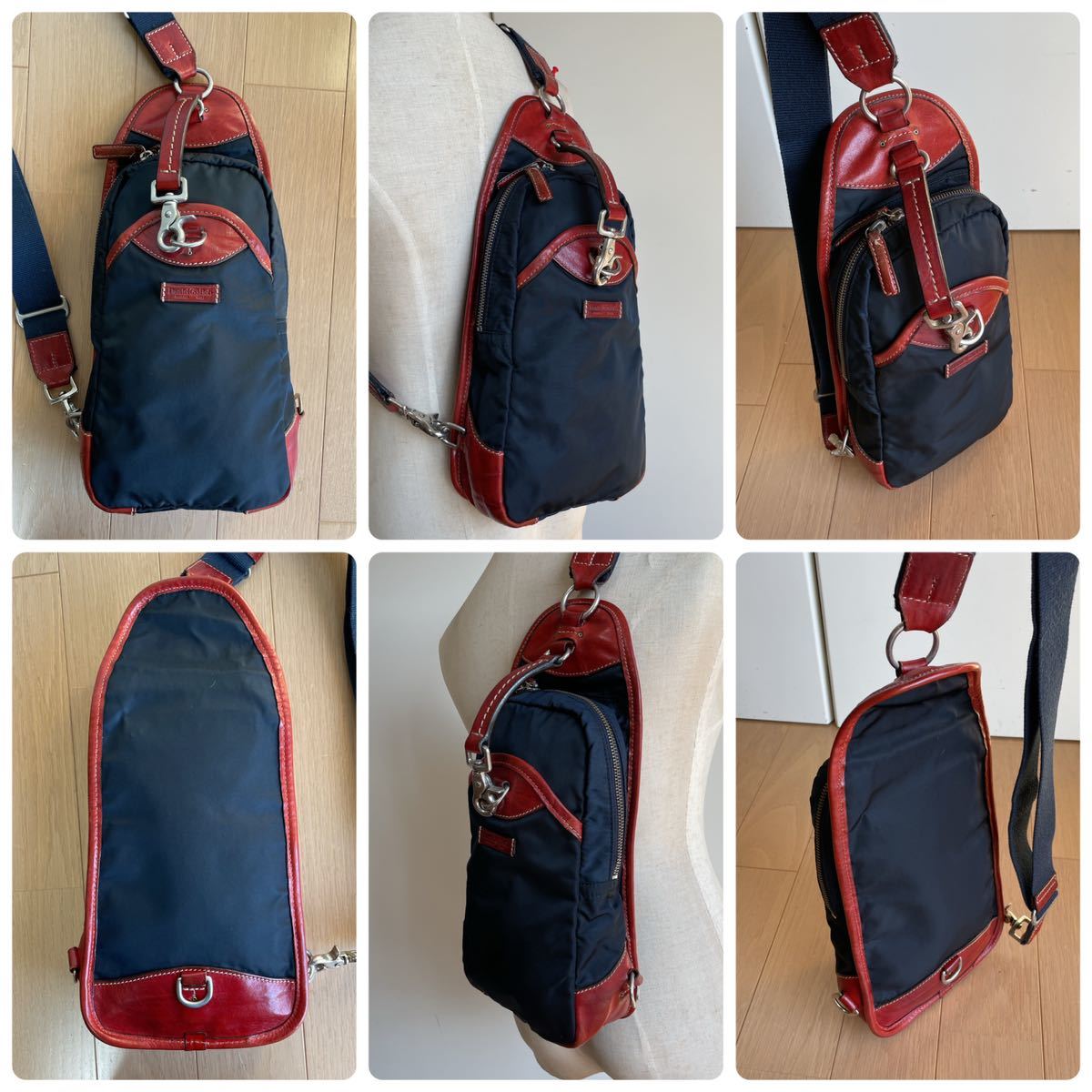 よくあるロディレザーではなくネイビーのナイロンとレッドブラウンのスムースレザーコンビで軽くて非常におしゃれです。