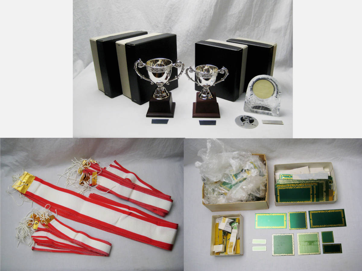 優勝カップ 表彰楯 ペナントリボン 彫刻プレート まとめて セット サンレオ含む ガラス製 金属製 記念品 スポーツ イベント 新品 化粧箱入
