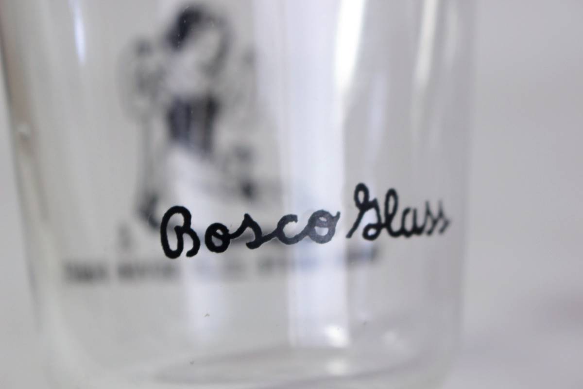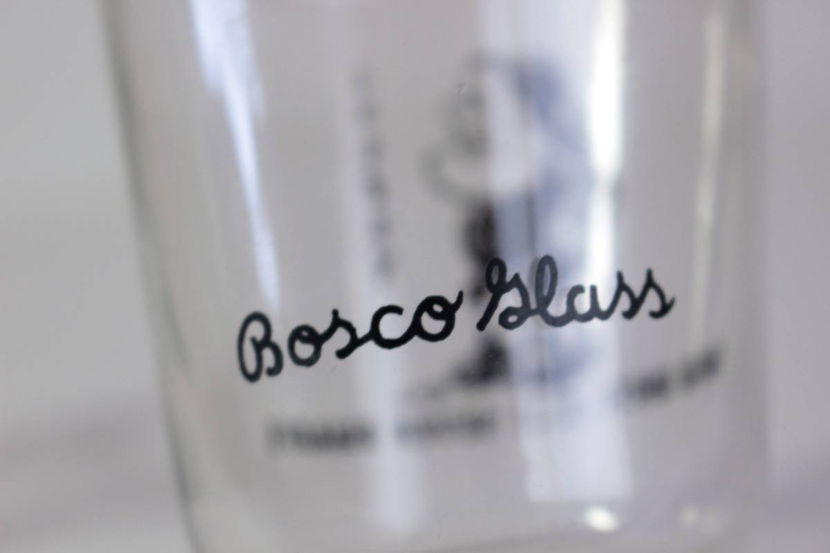 1928年に創業し、現在でも製造され続けているチョコレートシロップ「Bosco/ボスコ」のアドバタイジンググラスです。