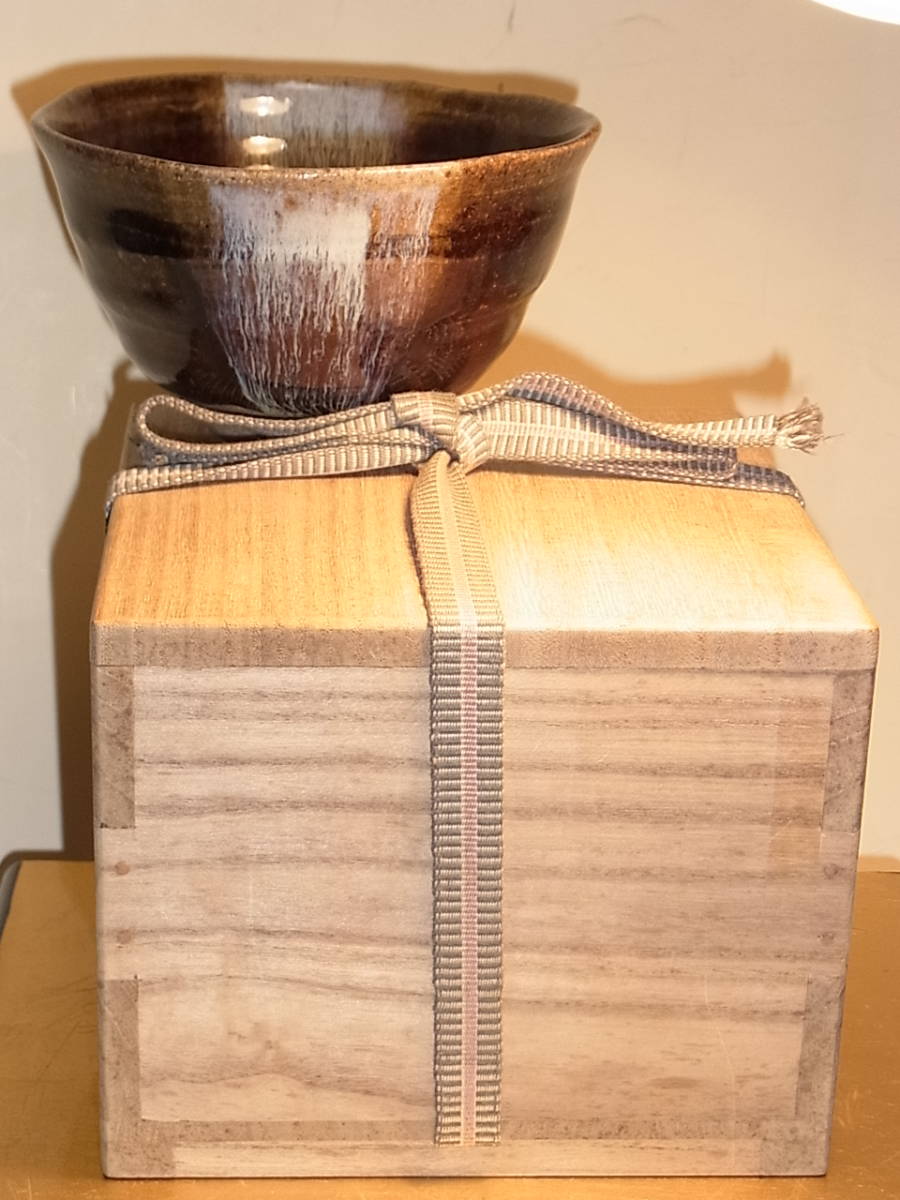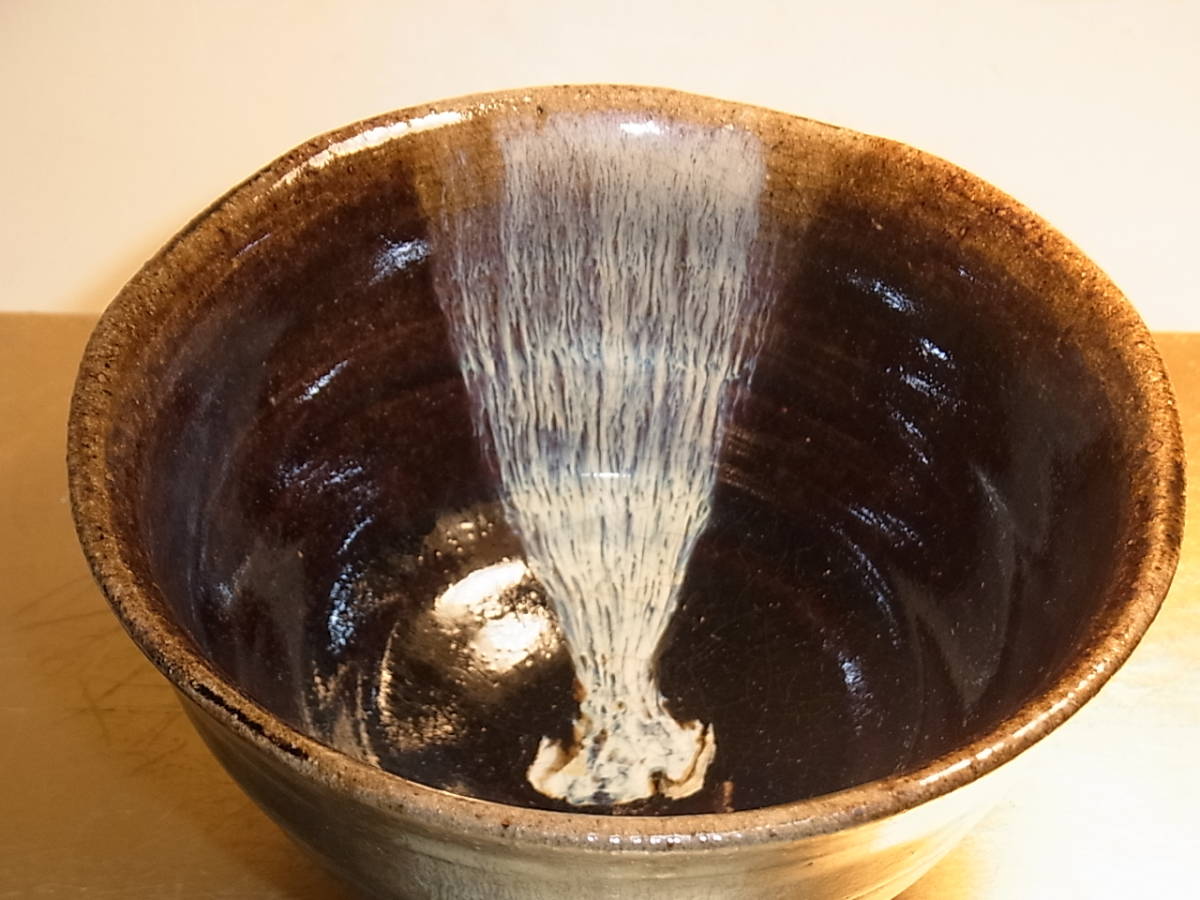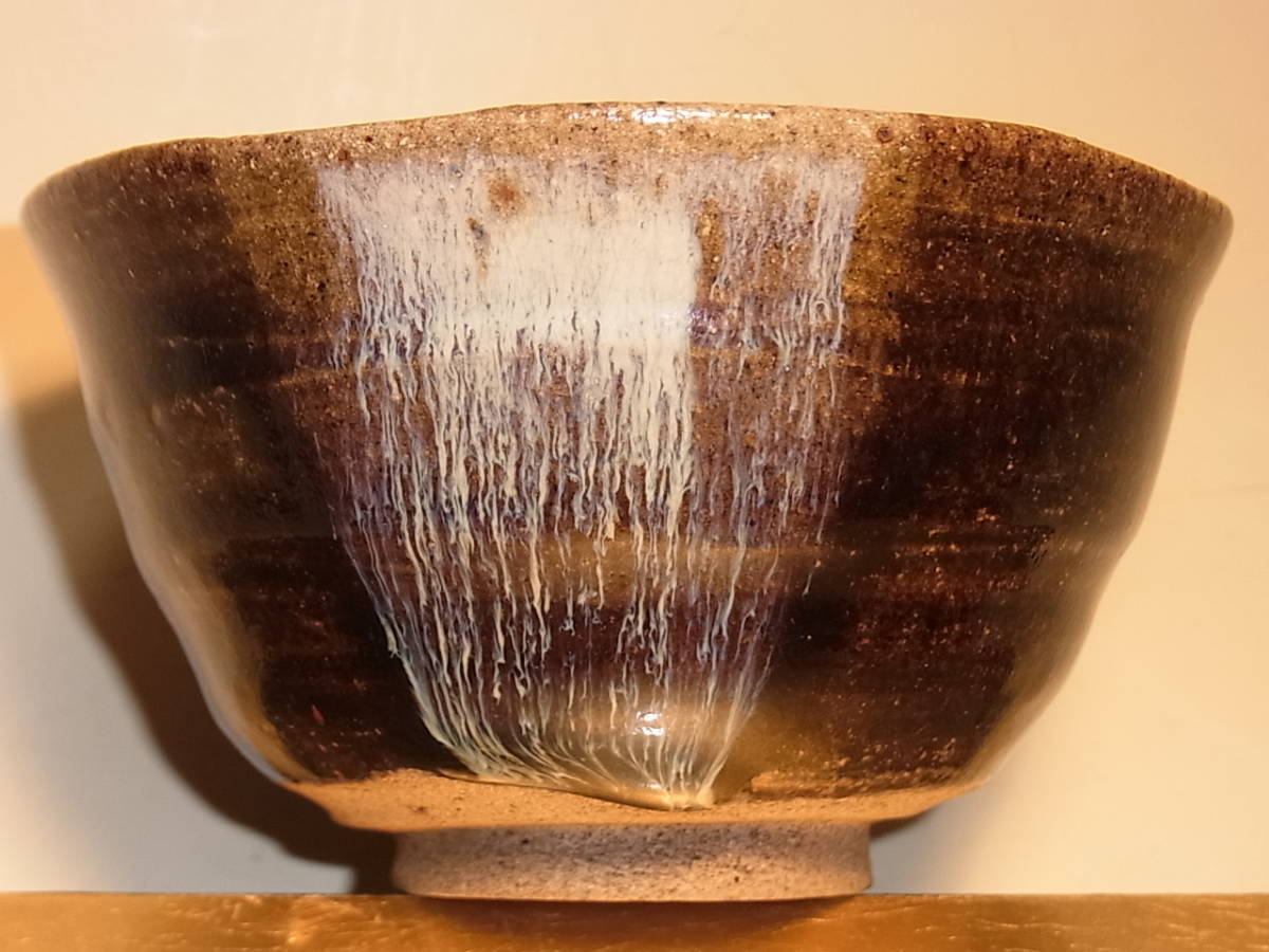 | ● 古朝鮮唐津茶碗・唐津茶碗 ● 雑器として造られたお茶碗ですが、さすがに唐津です。 アメ釉の上から白濁釉が程よく内外に掛け分けられています。 灰釉の流れは表前後に2ヶ所、内側前後に2ヶ所掛けられています。 表の灰釉はよく流れて白、青色等の色を発し、玉垂れとなって高台の 畳付際でかろうじて止まり裏側の流れは土見せでなんとか止まっています。 その内側の左右に流れた灰釉は中央の見込みと手前で終わっています。その灰釉の流れは桃山陶の物によく似て、大変に美しいです。 雑器にしては大変見事な朝鮮唐津のお茶碗で、内側は、アメ釉(鉄釉)にも 灰釉にも良く貫入が見られます。外側の釉の飴釉や灰釉の貫入は余りハッキリとは見られません。 時代は桃山末~江戸初期頃、窯は大川原窯か金石原系統かと思われます。 無傷で完品ですが古い物ですので、スレ等が御座います。又、故意でしょうが口周りは全体に波立った様な上下の歪みが見られます。 高台は外から押されたかのような跡があり、少々歪な仕上がりです。内には低いトキンが立ち、少々歪な三日月高台になっています。 明るい飴釉と鉄の黒さの良く出た上に、藁灰釉が上品に掛分けられ、美しさを醸し出しています。碗なりの静かで優しい感じです。お茶碗として使える素直な出来で、お茶を一服頂きたくなるお茶碗です。 注(・写真に出ている箱ではない)他の合わせ箱と仕覆付に成ります。 ●口径12.7~13.1cm、高台径5.2cm、高さ7.3cm、重さ263g ※大きさ重量等は判断の為の大体の目安数値ですので、ご了承下さい。 又、色合いもパソコンモニターにより若干の差異があるかと思います。 |