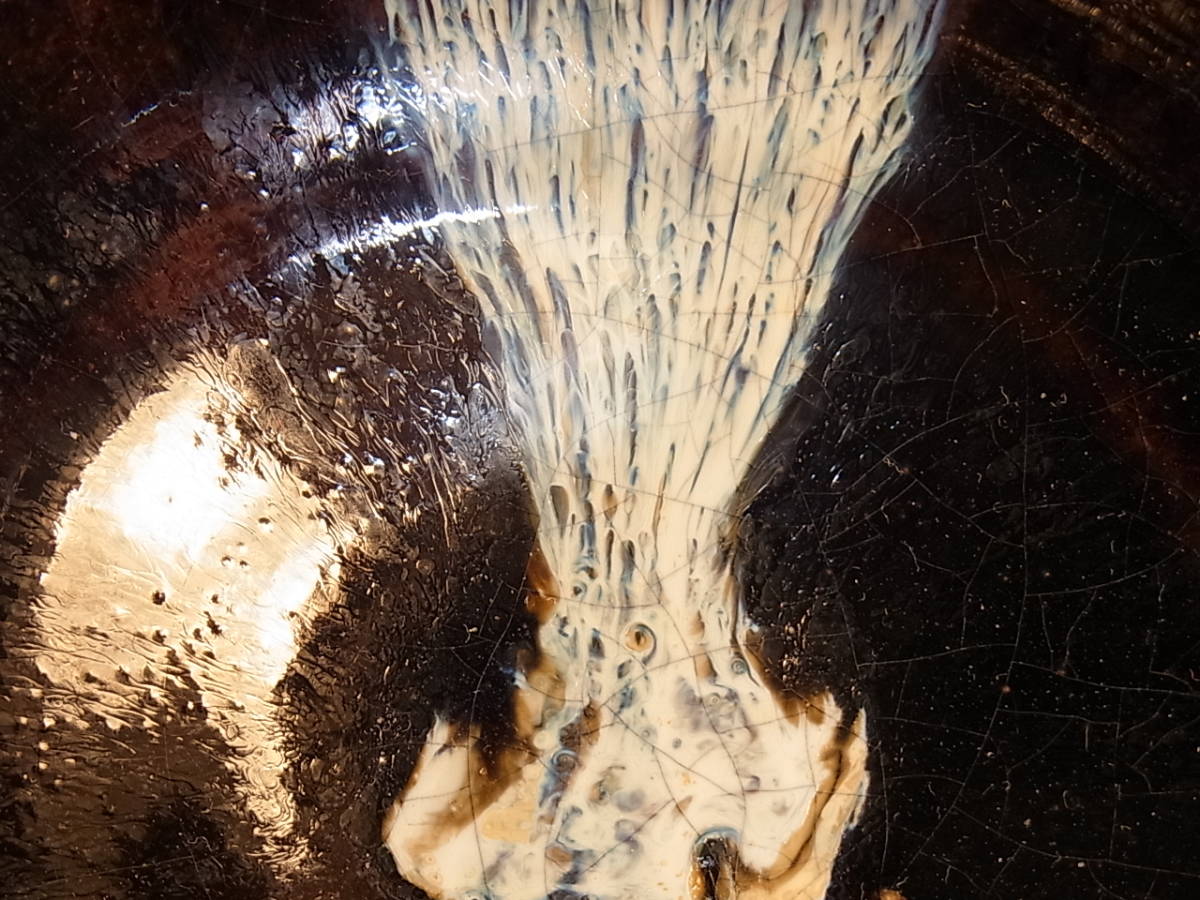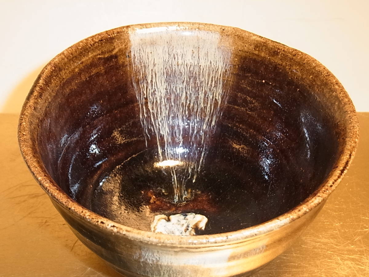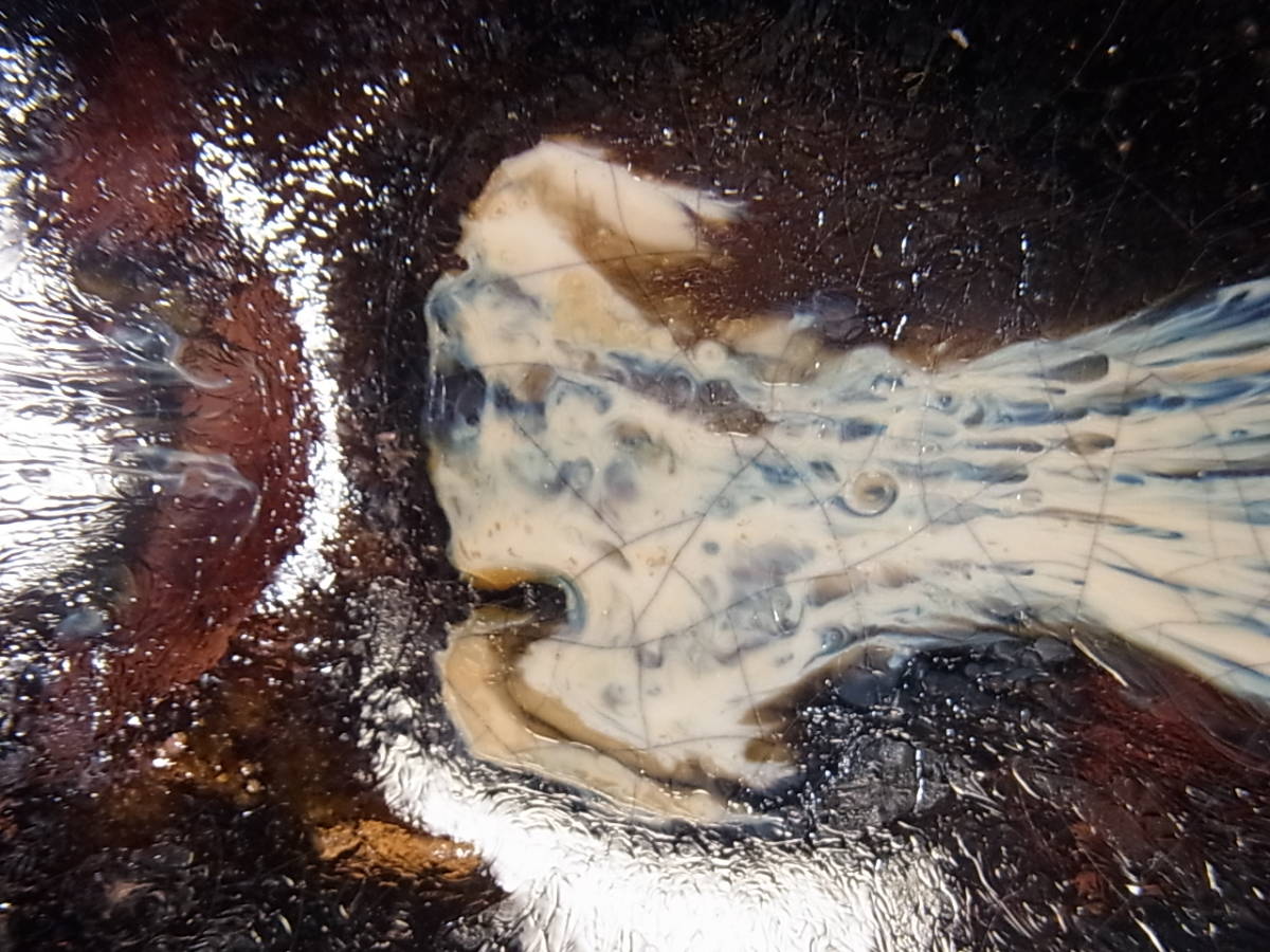 | ● 古朝鮮唐津茶碗・唐津茶碗 ● 雑器として造られたお茶碗ですが、さすがに唐津です。 アメ釉の上から白濁釉が程よく内外に掛け分けられています。 灰釉の流れは表前後に2ヶ所、内側前後に2ヶ所掛けられています。 表の灰釉はよく流れて白、青色等の色を発し、玉垂れとなって高台の 畳付際でかろうじて止まり裏側の流れは土見せでなんとか止まっています。 その内側の左右に流れた灰釉は中央の見込みと手前で終わっています。その灰釉の流れは桃山陶の物によく似て、大変に美しいです。 雑器にしては大変見事な朝鮮唐津のお茶碗で、内側は、アメ釉(鉄釉)にも 灰釉にも良く貫入が見られます。外側の釉の飴釉や灰釉の貫入は余りハッキリとは見られません。 時代は桃山末~江戸初期頃、窯は大川原窯か金石原系統かと思われます。 無傷で完品ですが古い物ですので、スレ等が御座います。又、故意でしょうが口周りは全体に波立った様な上下の歪みが見られます。 高台は外から押されたかのような跡があり、少々歪な仕上がりです。内には低いトキンが立ち、少々歪な三日月高台になっています。 明るい飴釉と鉄の黒さの良く出た上に、藁灰釉が上品に掛分けられ、美しさを醸し出しています。碗なりの静かで優しい感じです。お茶碗として使える素直な出来で、お茶を一服頂きたくなるお茶碗です。 注(・写真に出ている箱ではない)他の合わせ箱と仕覆付に成ります。 ●口径12.7~13.1cm、高台径5.2cm、高さ7.3cm、重さ263g ※大きさ重量等は判断の為の大体の目安数値ですので、ご了承下さい。 又、色合いもパソコンモニターにより若干の差異があるかと思います。 |