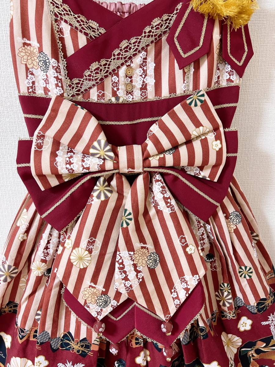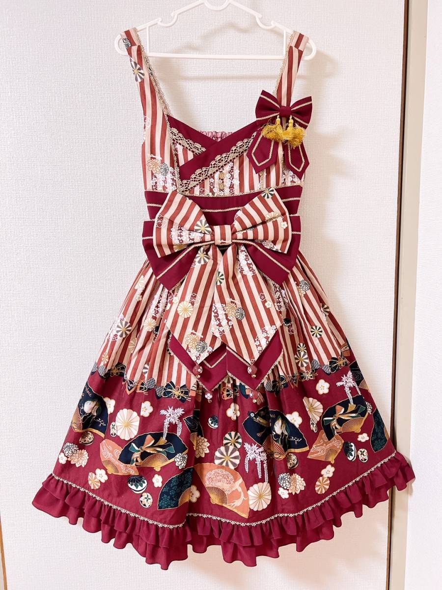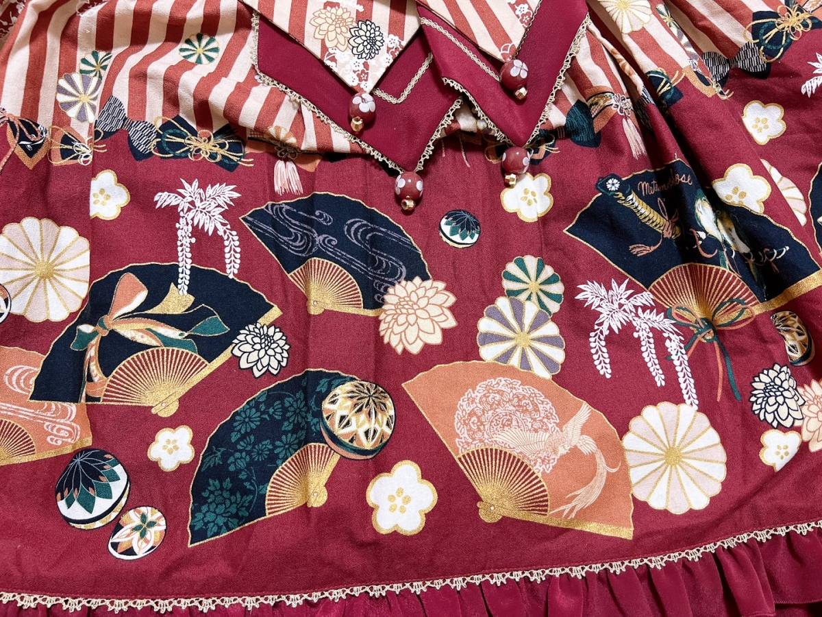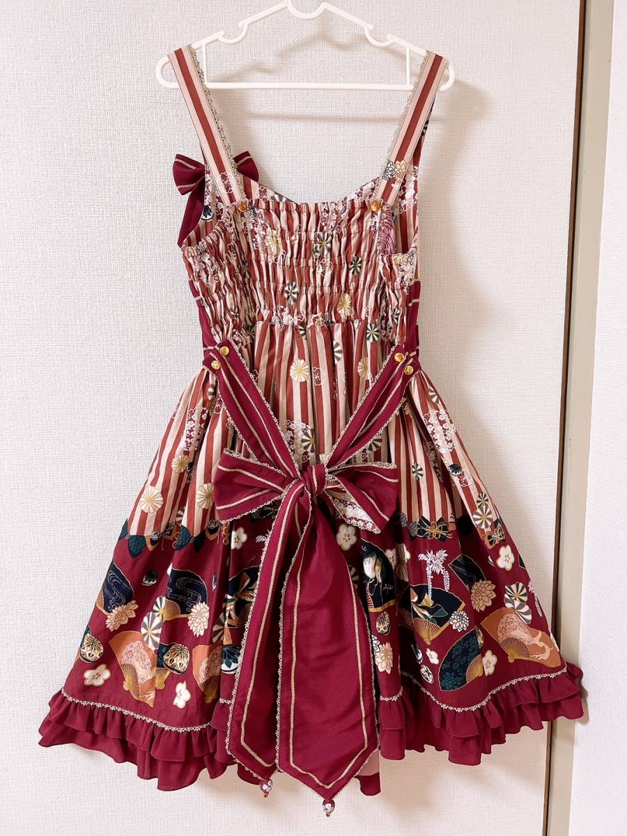 ・中古品 2回程着用 (定価 36,080円) ・えんじ系 ・艶やかな舞を思わせる扇をモチーフにした和柄の素敵なお洋服です♪ ・別布との配色がよりプリント部分を引き立て、きらりと輝くゴールドのレースが全体を引き締めてくれます。♪ ・前ウエストもリボンがとても大きく存在感があります!!後ろのリボンは、柄と無地のリバーシブルになっています。 ・背中シャーリングです。前ウエストリボン、後ろウエストリボンも取り外せます。 ・気に入っていたので、迷いはありますが大切にして頂けましたらと思います。 ・あくまでも中古の個人保管ですので、ご理解の上入札くださいませ ・全てを細かくはチェック出来ませんので、見落とすこともございます。ご了承願います。 ・保管時のシワはご容赦くださいませ。 |
