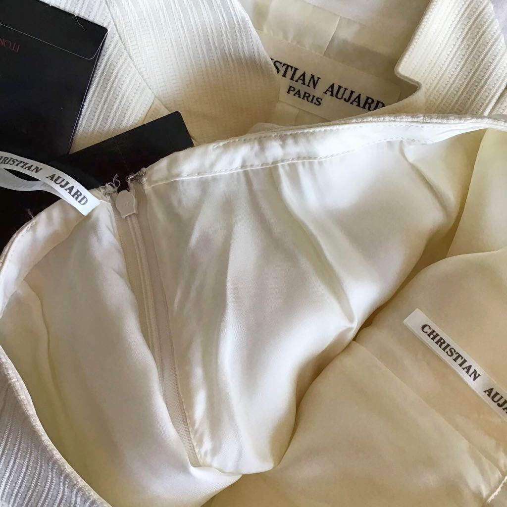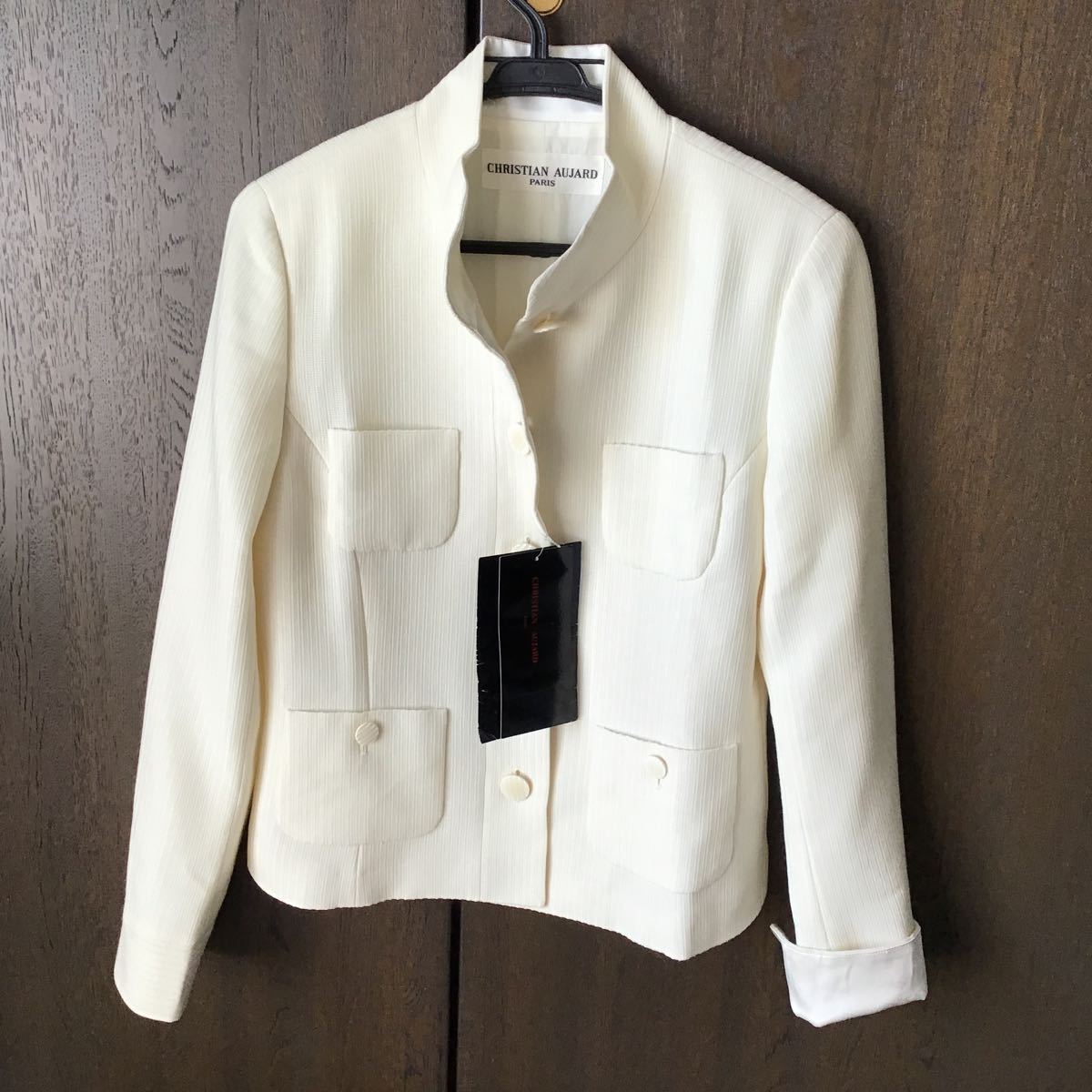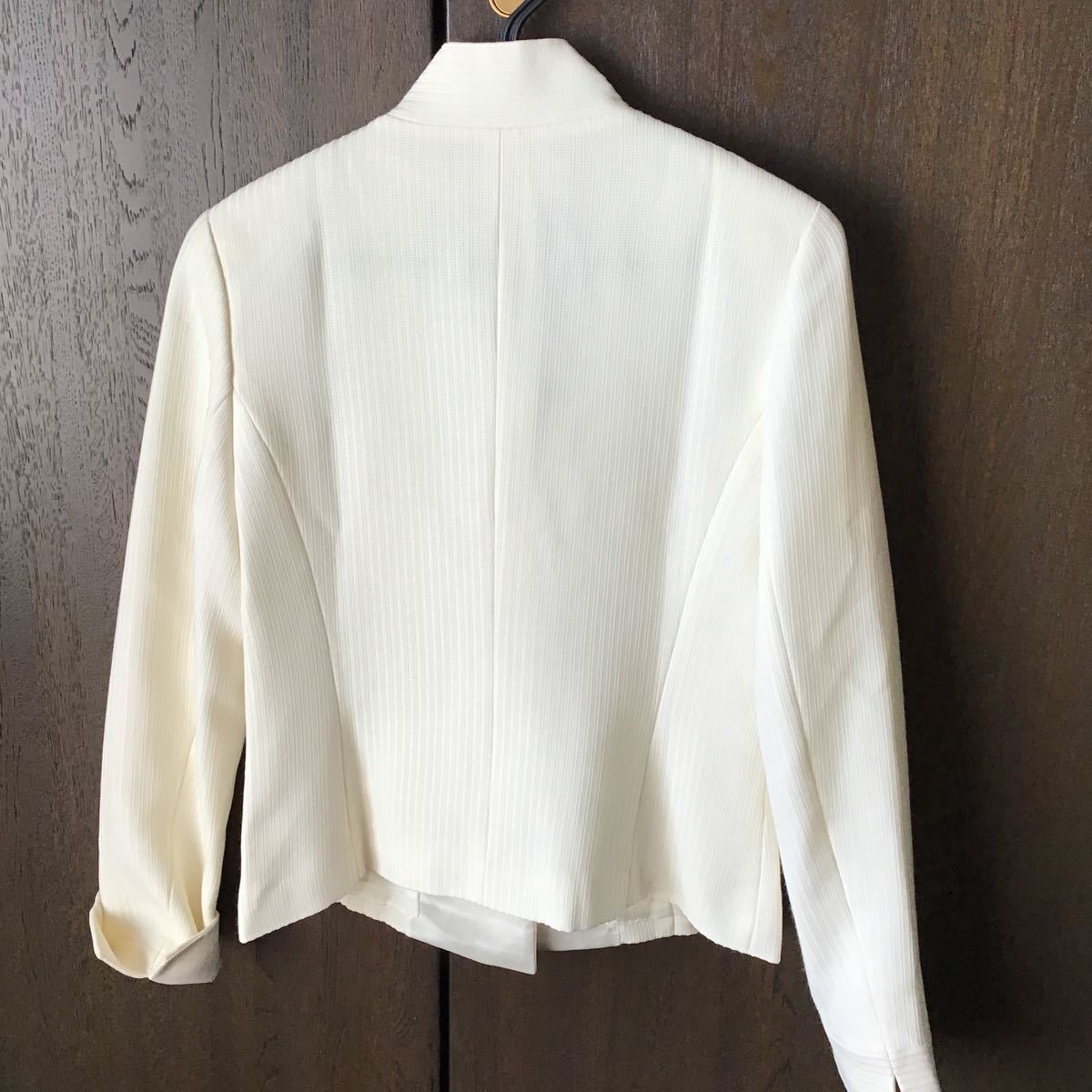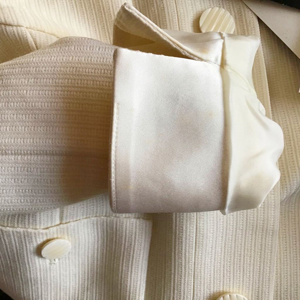 画像では分かりにくいですが、ラスト画像のように、1点訳ありです。折らなければ全く分かりませんが、右袖口裏のサテン生地全体に細かい線状の薄いシミが見られます。一度丁寧に部分洗いしたりクリーニングすると落ちるのかもですが、保証する訳ではありません。