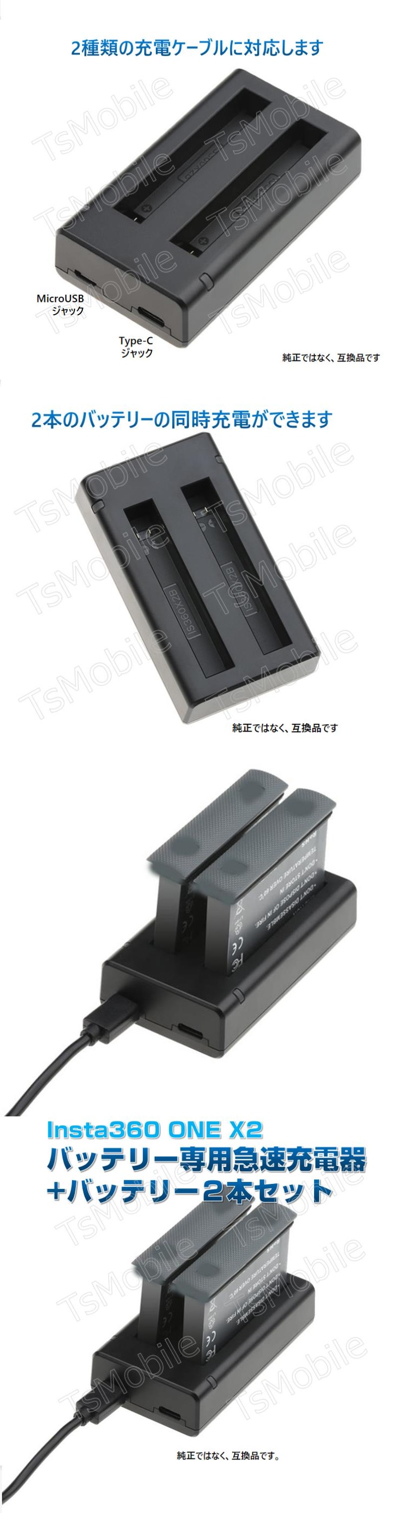 | Insta360 ONE X2 バッテリー 専用 急速充電器 充電ハブ互換品ですが、純正品と同じように使えます。3.85V 1700mAh確実な容量を確保します。入力(2種類の充電ケーブルどちらも対応):type C: 5V 2AMicroUSB:5V 2A生産国:中国簡易包装になります。※Insta360 ONE X2以外の機種には対応していません。Insta360 X2 バッテリー専用急速充電器 と バッテリー2本セット |