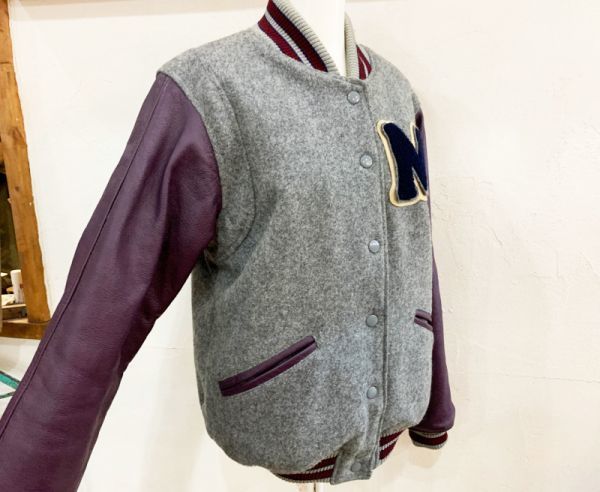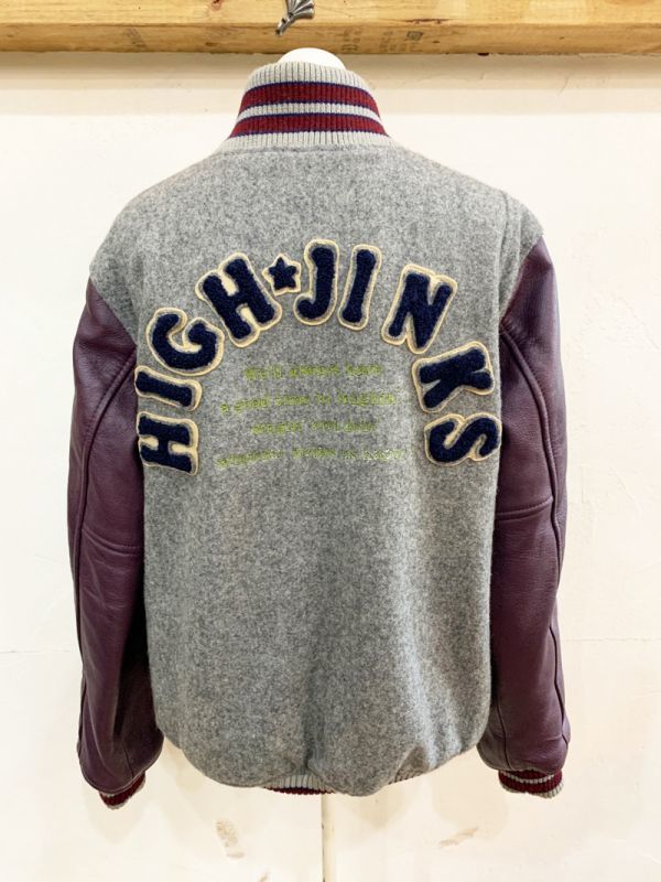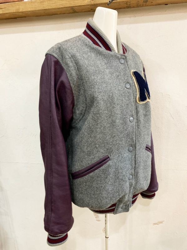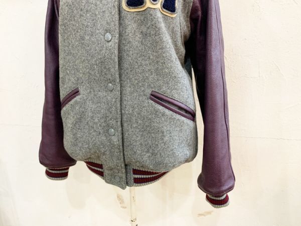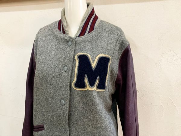R96★IIMK/アイアイエムケー ミッシェルクラン ウール混ロゴワッペンスタジャン 灰 中綿入 刺繍 リブ カジュアル USED ★