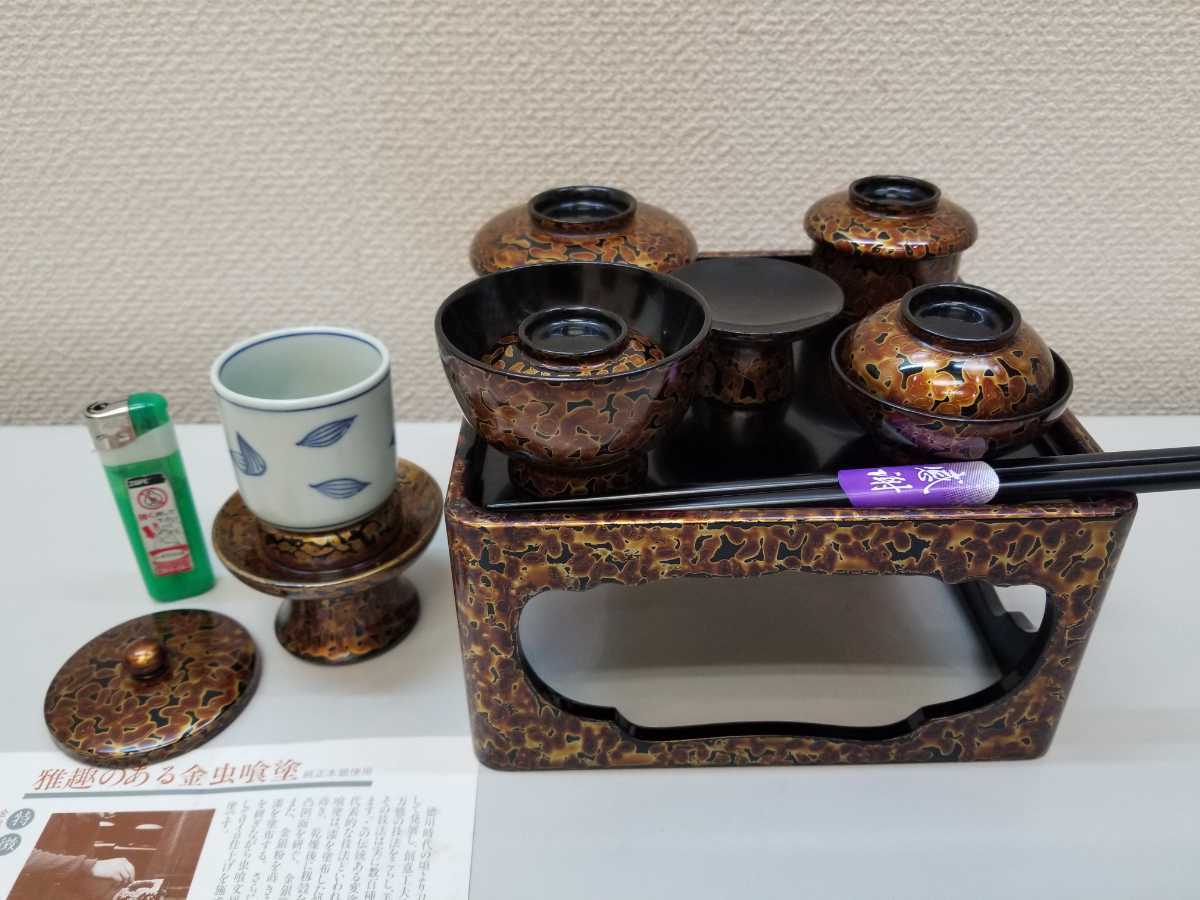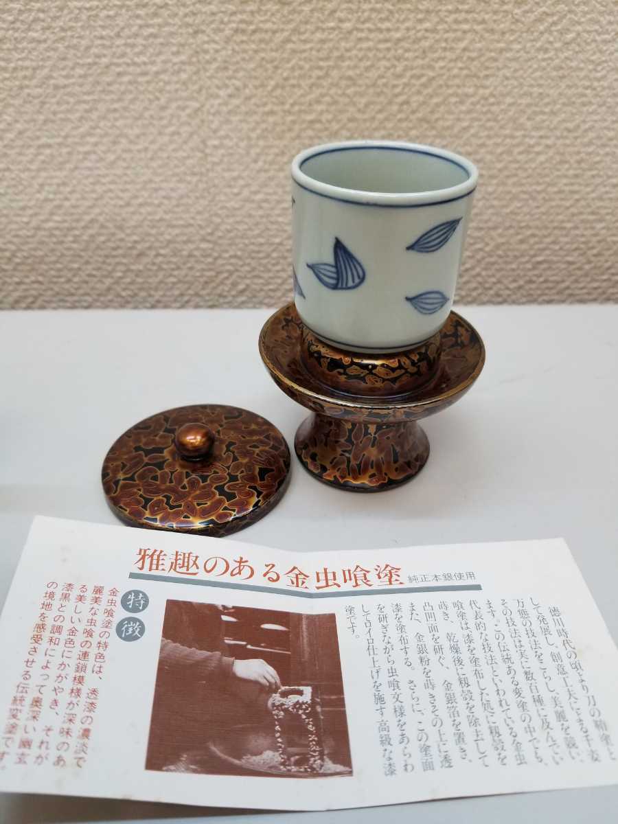 今回特別にオマケで金虫喰い塗の茶湯器を一組お付けします(湯呑は陶器製です)