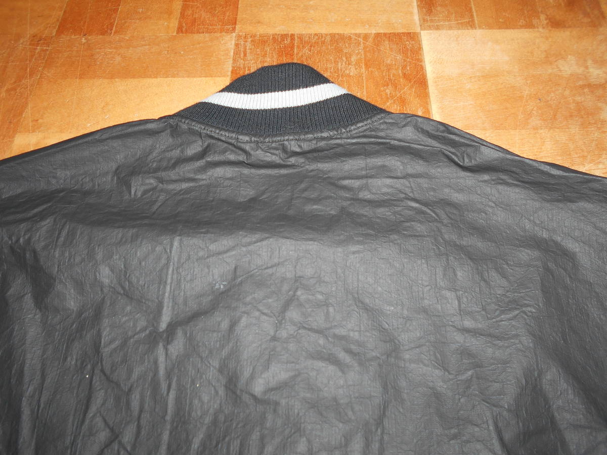 襟と袖口に黒Xライトグレー系のリブニットを付けたスタジアムジャンパーになってます。