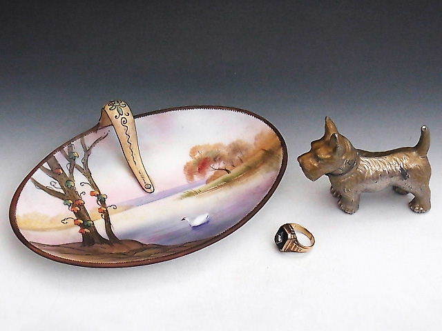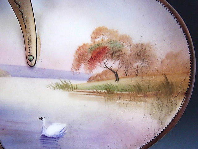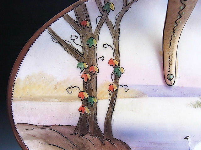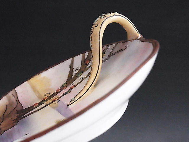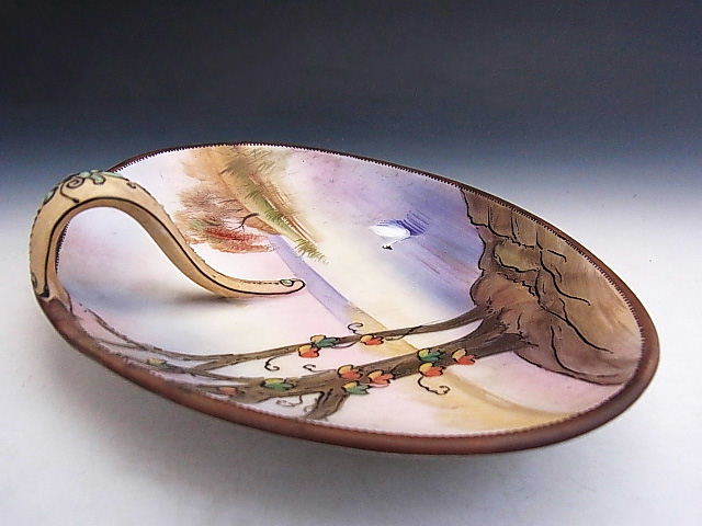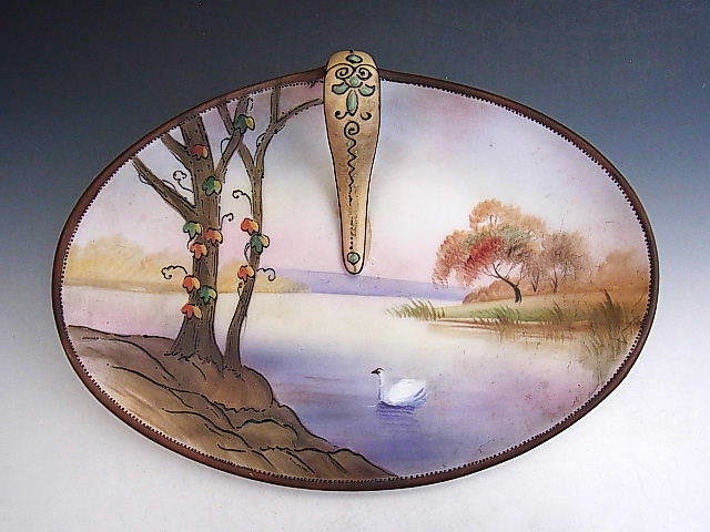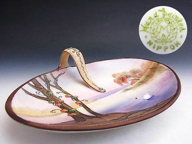 艶消し風景絵 楕円形 ハンドル皿 ◆ オールドノリタケ