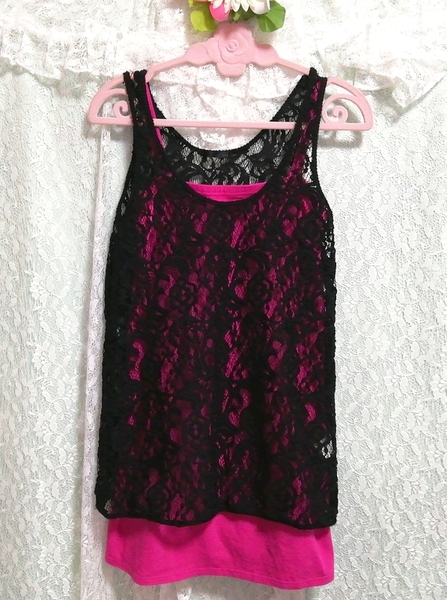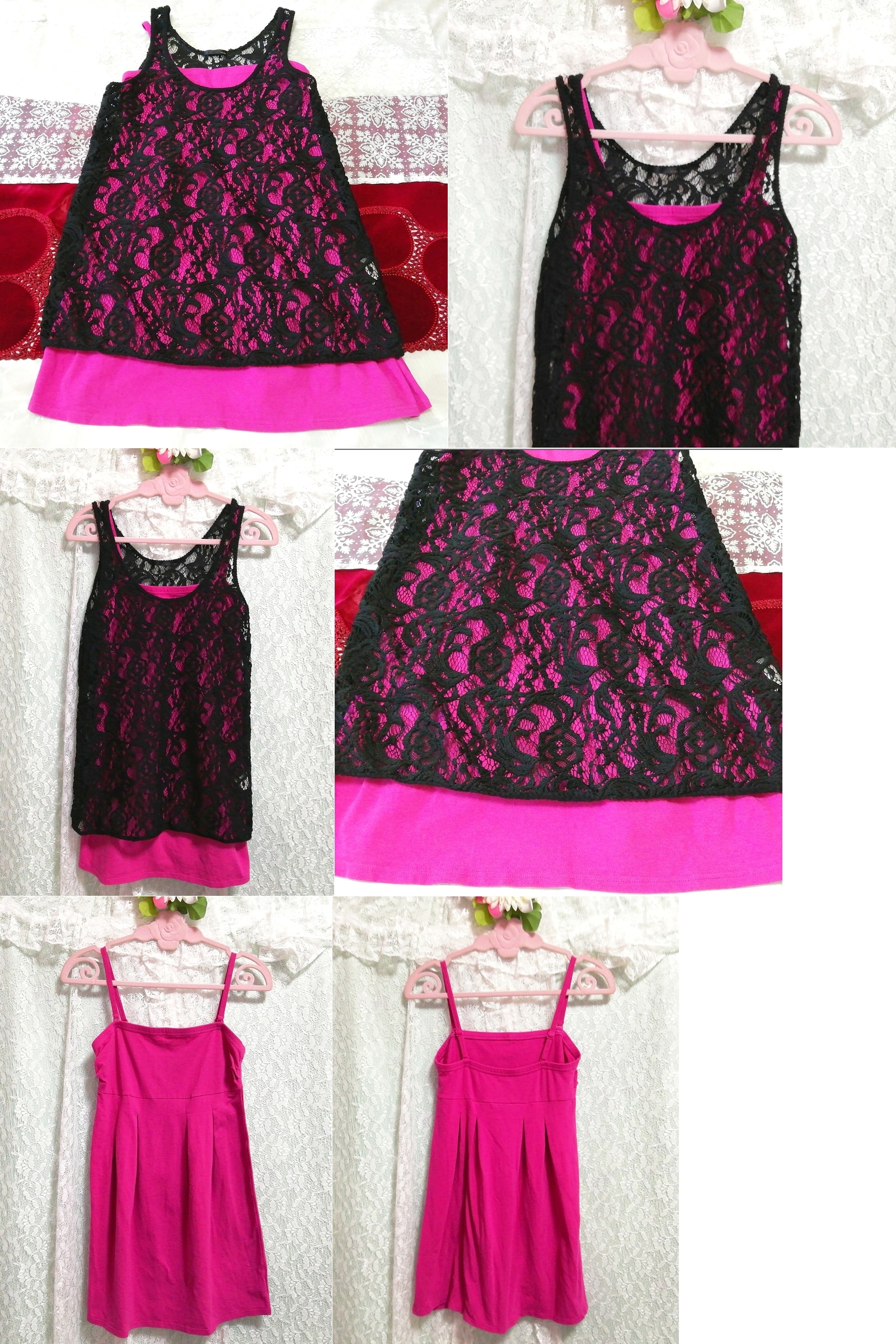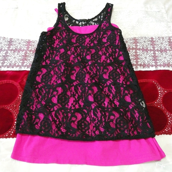 黒ノースリーブニットチュニック ネグリジェ マゼンタキャミソール 2P Black sleeveless knit tunic negligee magenta camisole