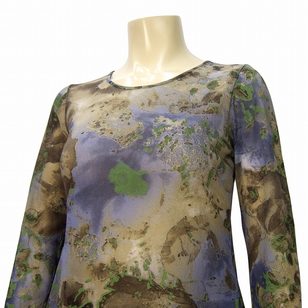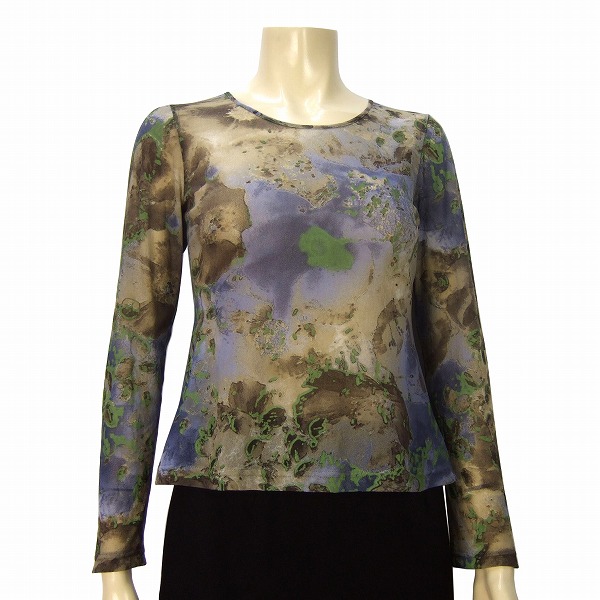 **・゜魅惑の大人チュールネットカットソーです。透け感のある伸び良いチュールネット素材×淡いヒヤシンスブルー系&アイボリー系グラデーションにシーグリーン系の模様が描かれた上品なモダン柄デザイン♪高級感溢れる上級長袖カットソーです。*:.。