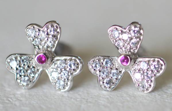 三つ葉のクローバーの真ん中に赤い石がついております。