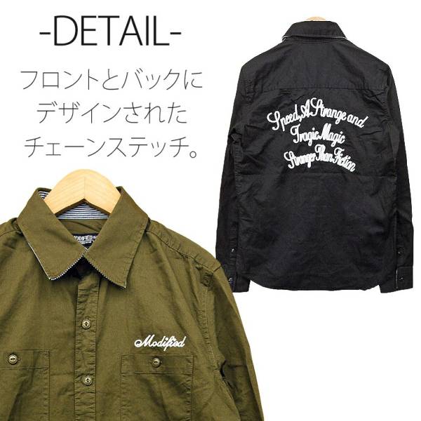 | ざっくりと羽織れるワイルドな1枚 フロントの胸元、バックにチェーン刺繍が大きく入っております。 襟裏とカフス裏にはヒッコリー生地が使用されており、 細部まで手の込んだデザインの一品。 綿100%の羽織りやすい柔らかい素材。 ■ブランド■ ■Modifid■ 【サイズ平置き】 Mサイズ/Lサイズ/XLサイズ 着丈:68cm/70cm/71cm 横幅:51cm/52cm/54cm 肩幅:41cm/43cm/44cm 袖丈:60cm/61m/62cm ※XLサイズはタグ表記がLLサイズもございますが同じサイズになります。 *若干のサイズの誤差は御了承下さい。 |