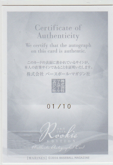 パックから出るルーキー版の直筆サインカードで、10枚のシリアルナンバーが入っています。シリアルナンバーは01/10のファーストナンバーです。