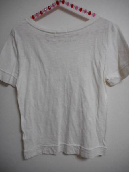 【ブランド・形態】 COLZAです。 【カラー】 白色にベアのロゴとイラストです。 掲載の実物写真はPC環境や光の加減により実物と色合いが若干異なる場合があります。 【特徴】【状態】 ラウンドネックのリボンベア柄イラストとロゴ入りのシンプルなTシャツです。 前身頃のすそに目立たない程度の薄シミ有るのでお知らせします。 詳細は写真参照でお願いします。 少々使用感はございますが、特に目立つダメージは見受けられず、着用に問題無いと思われます。 お洗濯による毛羽立ち、素材によるこすれ程度がうっすらはあります。 光の加減で、白っぽく写った写真も有りますが、濃い写真が近い色合いです。 【素材】 綿100%です。 (写真参照) 【記載サイズ】 サイズはMとなっておりますが実寸も参考にして下さい。 【実寸サイズ】{平置き採寸} 縮みや伸びが生じている場合がありますので実寸サイズをご参照ください。 着丈 : 約55cm (背面襟下から裾まで) 肩幅 : 約38cm (両肩を直線で結んだ線) 身幅 : 約43cm (両脇を直線で結んだ線) 袖丈 : 約19cm (肩縫い目から袖先まで ) 尚、素人採寸です多少の誤差はご了承下さい。 裄丈 : 約---cm (後衿ぐり中央から肩先までを水平に計った長さと、 肩先から袖口までを足した値 ) | |||