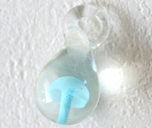 透明ガラスの中の水色のキノコのペンダントトップです。