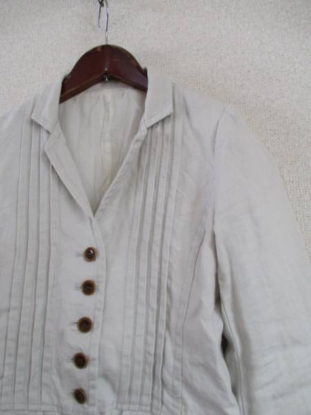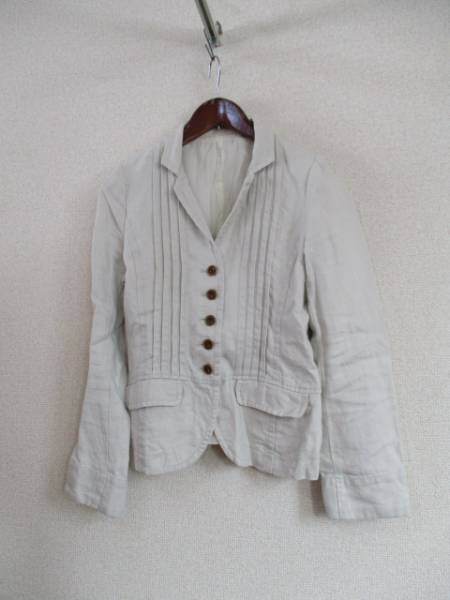 | 商品紹介 | 淡いブルーグレーの色合いがキレイなリネンのジャケットです。 左右のピンタックがデザインのポイントになっています。 裾に切替えがあり、後ろウエスト部分はギャザーが入っています。 きなり色のガーゼ素材の裏地が付いていて、着やすいです。 《素材》 表地:麻100% 裏地:綿100% |